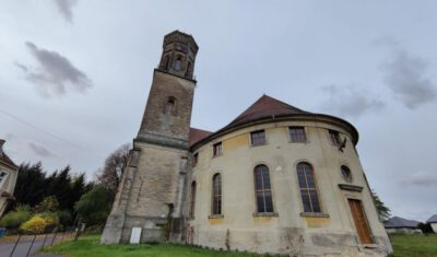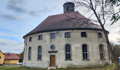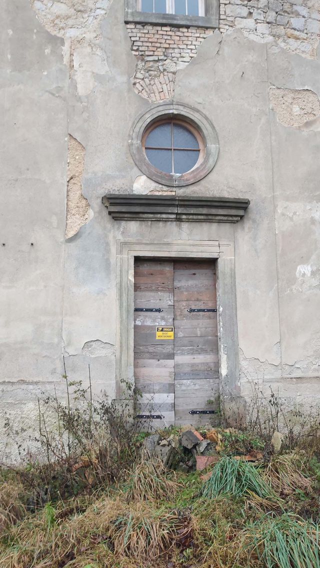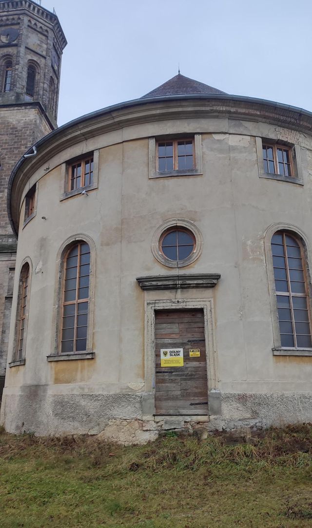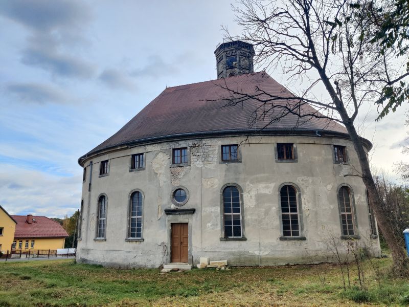 Die ende des 18. Jahrhunderts entstandene ehem. evang. Dorfkirche ist einer der ganz wenigen Sakralbauten in Polen mit einem ellipsenförmigen Grundriss. Nachdem die gemeinnützige Stiftung Fundacja „Twoje Dziedzictwo“ (Dein Erbe) von 2013 an die Emporen notsichern und u.a. mit Mitteln des polnischen Ministeriums für Kultur und Nationales Erbe und Marschallamts der Woiewodschaft Niederschlesien die Dachkonstruktion hat partiell stabilisieren und die Dachhaut erneuern können, ist es ihr gelungen, 2018 erneut eine stattliche Zuwendung des polnischen Kulturministers für die Reparatur des Deckengewölbes und die Weitersicherung der Emporen zu erhalten. Indes konzentrierte sich der von der DPS mit Bundesmitteln 2018 geförderte Teilbauabschnitt 1 Turm auf die Wiederbegehbarmachung des Turms mit Wiederherstellung des Übergangs zur ehemaligen Patronatsloge zur Nutzung als Aussichtsplattform. Interessierte Besucher sollen von hier aus, von wo der Raumeindruck besonders wirkungsvoll ist, solange die Baustellenkirche bestehen wird (voraussichtlich bis 2022) gesichert den imposanten elliptischen Innenraum und die Innenbaumaßnahmen im weiteren Verlauf betrachten können. Als künftige Nutzung sind u.a. Veranstaltungen vorgesehen, die dem landwirtschaftlichem Charakter der Umgebung Rechnung tragen, und die eines größeren Raumes bedürfen, als dies mit dem Saal im jetzigen Dorfgemeindehaus gegeben ist. Für eine künftige Nutzung der ehemaligen Kirche als Konzertsaal engagiert sich in Zusammenarbeit mit dem Denkmaleigentümer der Görlitzer Ars-Augusta e.V., Verein zur Förderung der Künste und Völkerverständigung in der Europastadt Görlitz-Zgorzelec mit der griechischen Sopranistin Eleni Triada Ioannidou.