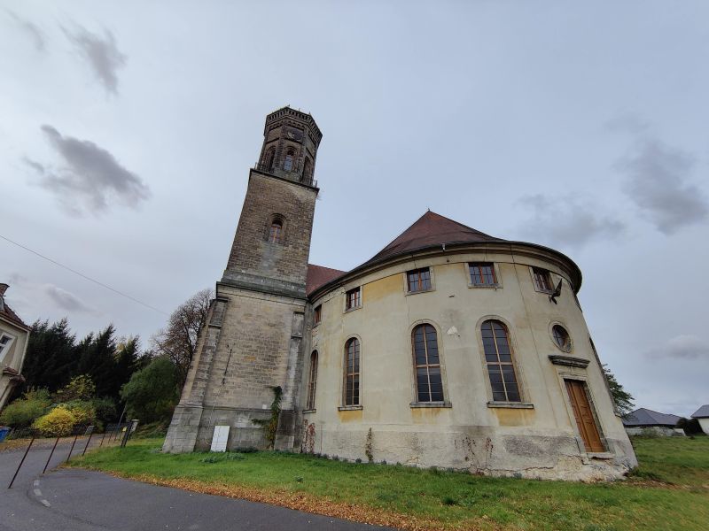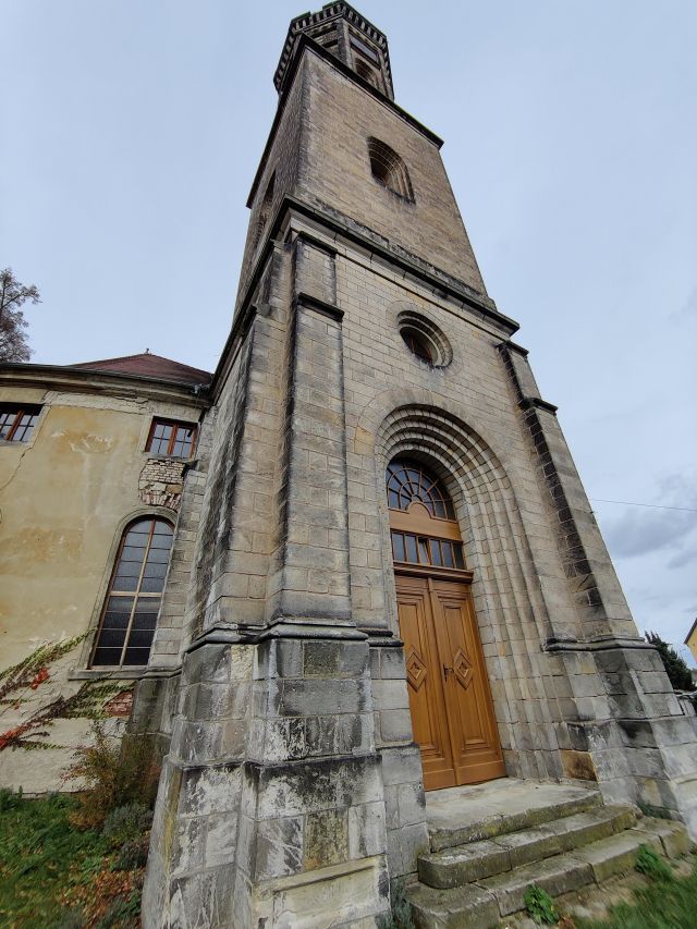 Bis zum Ende des Zweiten Weltkrieges gab es zwei funktionierende Kirchen im Dorf, die evangelische und in 400m Entfernung die katholische. Der Ev. Kirchenbau war viel prächtiger als die Pfarrkirche Johann-Nepomuk, die aus der Mitte des 14. Jhs. stammt und um 1600 und im 19. Jh. umgebaut wurde. Ab 1945 verfiel die verlassene evangelische Kirche von Jahr zu Jahr. Das Turmdach musste abgetragen werden, da sein Gewicht den Turmschaft statisch überstrapazierte und instabil werden ließ. Mit dem Abtragen wollte man dem Einsturz vorbeugen.