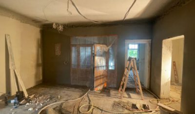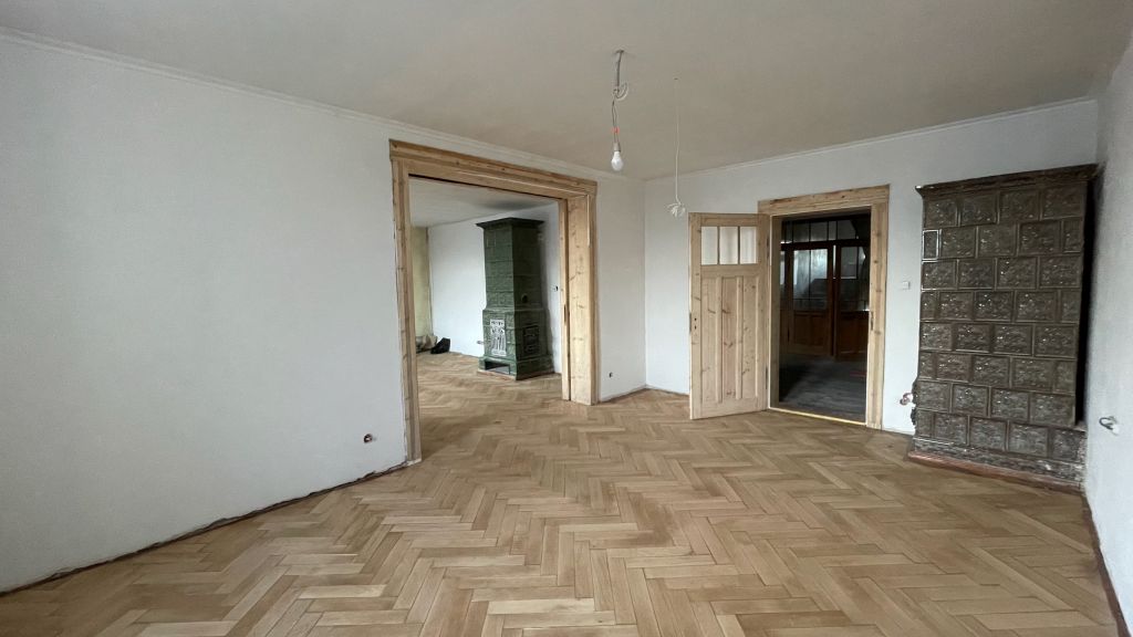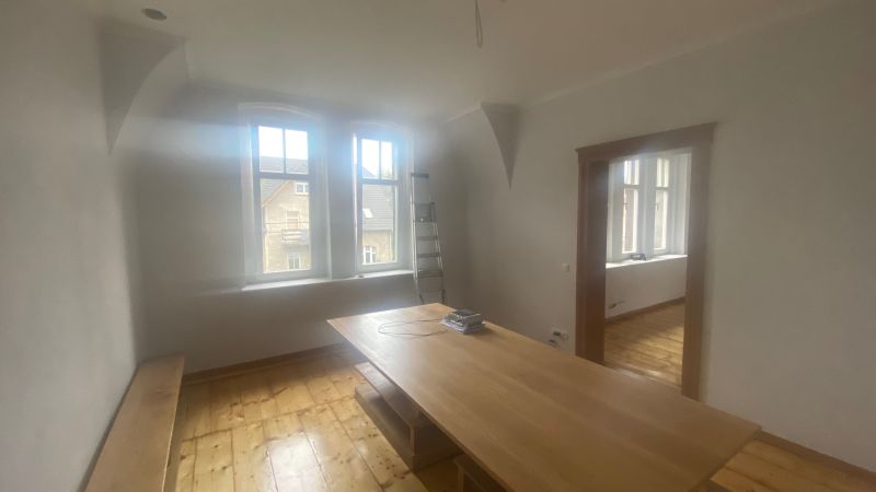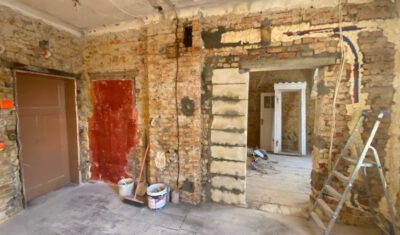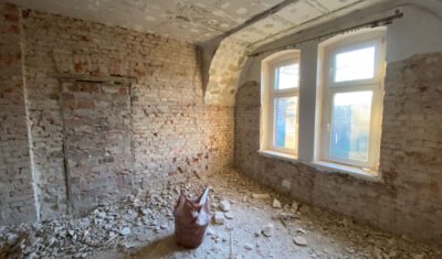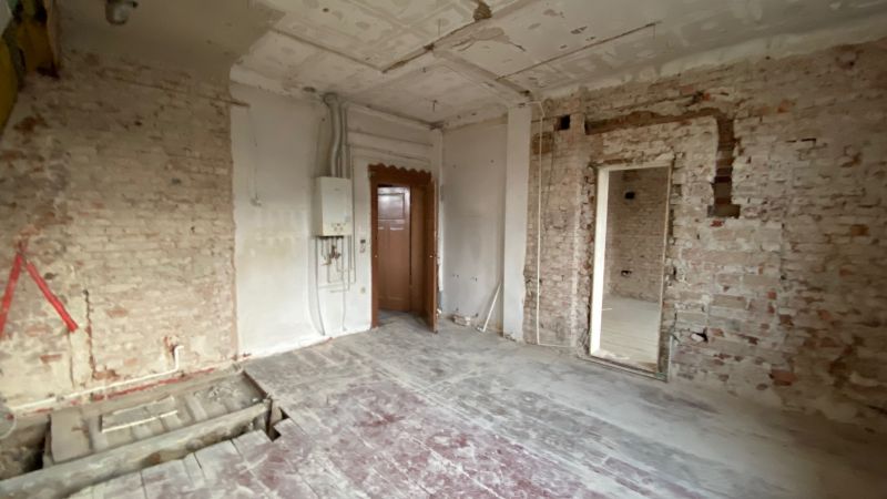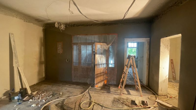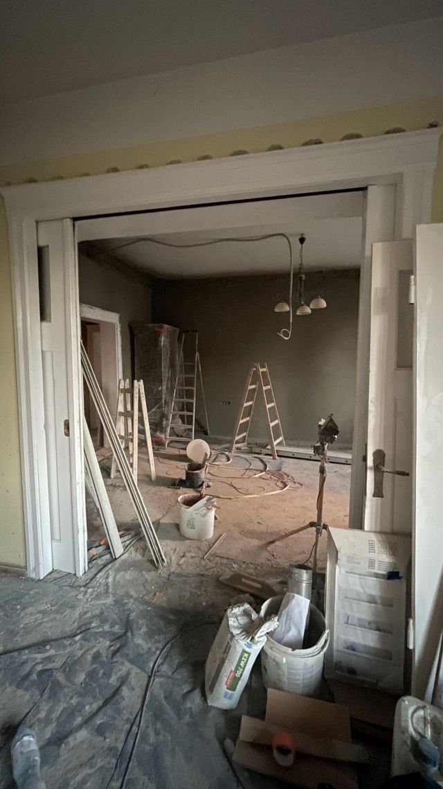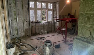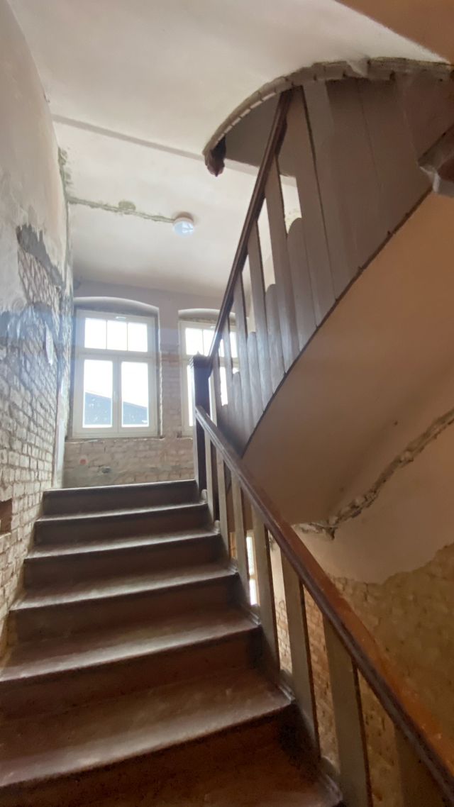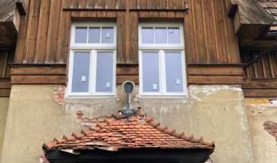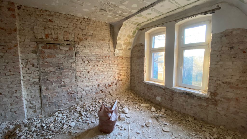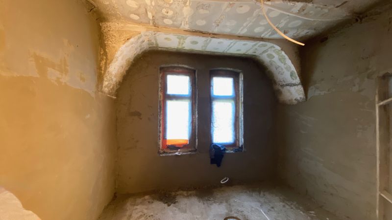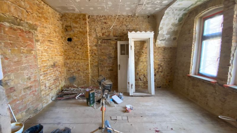 Bei dem Haus wurde von 1945 bis 2020 am Gemeinschaftseigentum rein gar nichts gemacht. Man ließ die Substanz gnadenlos verfallen und „hauste“ lediglich in ihr. Und wenn etwas an den Wohnungen gemacht worden ist, dann mit Baumarkt-Methoden, ohne Rücksicht auf Bestand, gerade im Mansardgeschoss regelrecht tragisch. Die Fenster sind ebenfalls ein gutes Beispiel. Strukturelle Schäden wies der Dachstuhl auf, gerissene Schornsteine, verrottete Deckenbalken und schwere Wasserschäden komplettierten das Schadensbild. Die Remise (als Autogarage) war akut einsturzgefährdet. Viele tragende Elemente waren völlig verrottet durch ein jahrzehntelang undichtes Dach. Auch wenn es hart klingt, die Schäden waren teilweise so weit fortgeschritten, dass ein „normaler“ Eigentümer wohl eher an Abriss hätte denken können.