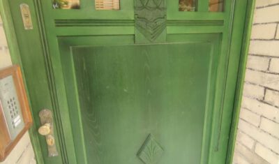 Der Haustürrahmen ist mit einer einflügeligen Holzrahmentür versehen, die mit schlichten geometrischen und floralen Jugendstilornamenten verziert ist.