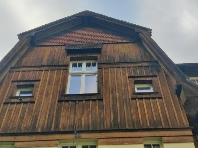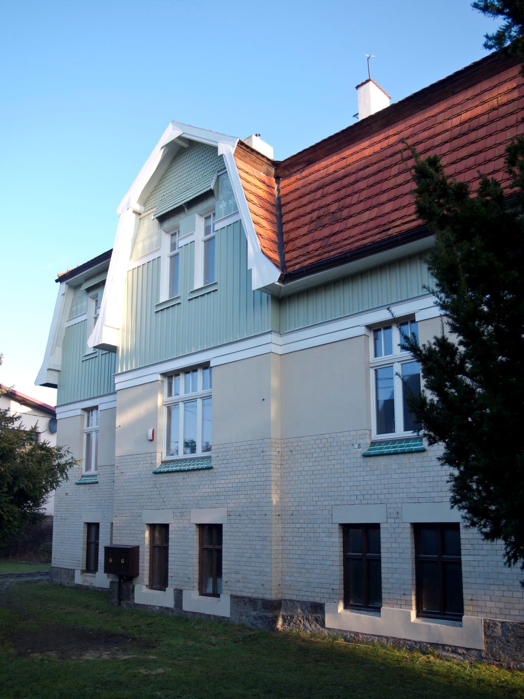 Über dem Eingang und den beidseitigen Fensteröffnungen erstreckt sich ein dreifach geneigtes Dach mit unregelmäßigen Dachflächen und belegt mit keramischen Görlitzer Ziegeln, die ein spitzenartiges Muster aufwiesen. Die Dachspitze bildete eine filigran gestaltete Fiale mit einem konkaven Okulus, dessen Innenseite mit einem an eine Baumkrone erinnernden Rosettenmotiv bemalt war. Der Landhausbau mit gestufter Fassade inkl. Giebelrisaliten wurde mit einem hohen, sechsteiligen Mansarddach überfangen, das die Dachtraufe betont.