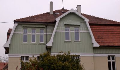 Dachgauben und Anbauten, die das Dachgeschoss erhellten, versah man mit Pultdächern. Die Dachtraufen wurden an der Unterseite ringsum mit einer schablonierten, bemalten Applikation in Form geometrischer Details im Jugendstil verziert (Rosetten in sechseckigen Feldern mit radialer Unterteilung, eingefasst von einem gestreiften, gestrichelten Rand, getrennt durch längliche, rautenförmige Polygone, jeweils drei in einer Reihe). In Höhe Oberlicht der oberen Fenster, das heißt zwischen Brettverschalung und Verschindelung, formte man die Fassaden-Holzverkleidung als glatten horizontalen Streifen aus, um Schablonenmalerei in Gestalt von Jugendstilornamentik darauf zu applizieren. Diese wurde zweiteilig gestaltet, d.h. im unteren Teil dem geometrischen Jugendstildekor verpflichtet, während sie im oberen Teil mehr der vegetabilischen Variante entsprach. Die Ornamentmalerei wurde weißfarben aufgetragen, der Anstrich der gesamten Fassaden-Holzverkleidung mintgrün. Mit der gediegenen Farbigkeit, dem zarten Abheben der Ornamentmalerei vom mintgrünen Hintergrund wurde dem Landhaus ein vornehmes Aussehen verliehen.