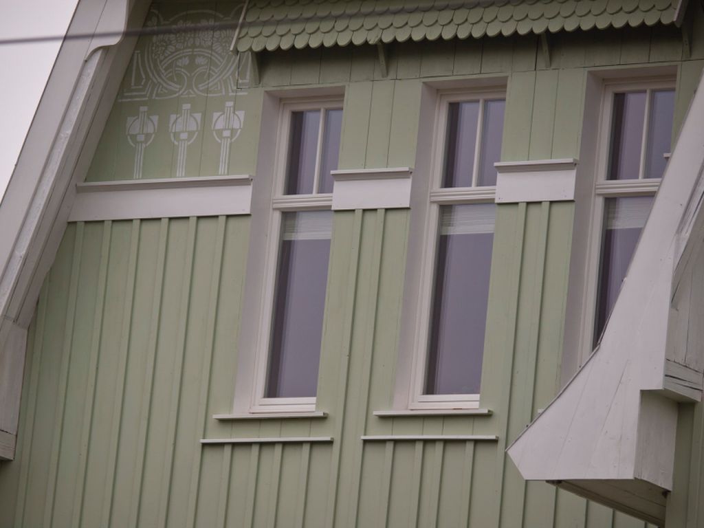 Die stilistische Einzigartigkeit des Gebäudes manifestiert sich in der Verwendung einfacher und sparsamer Fassadenkompositionen, die im Kontrast zu reichen, markanten architektonischen Details stehen. Dazu gehören die grünglasierten Keramikfensterbänke und dekorativen Metall-Lüftungsgitter, ein ungewöhnlicher Giebel über dem Eingangsdach und vor allem der bemalte Besatz am unteren Rand der Dachtraufe und teilweise an den Säumen der Vorsprünge. Der malerisch geformte Baukörper, ergänzt durch pflanzengeometrische Ornamentik, korrespondiert im Detail mit der umliegenden Grünfläche und fügt sich dem Konzept eines Hauses mit Garten als Erweiterung der umgebenden Landschaft ein.