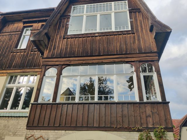 „Es ist leider tragisch“, schrieb uns der Hauseigentümer, „wie mit dieser Architekturströmung in der Region umgegangen wird. Es sind viele Gebäude strukturell intakt. Wenn man aber kein konservatorisches und städtebauliches Zeichen setzt, werden in absehbarer Zukunft diese Objekte ebenfalls mit Styropor zugeklebt. Die Bewohner und besonders der hiesige Denkmalschutz wissen es einfach nicht besser, dabei sind durchaus die Finanzen mittlerweile vorhanden. Es fehlt allein das Beispiel.“ Und hier gibt es dieses Beispiel nun also.