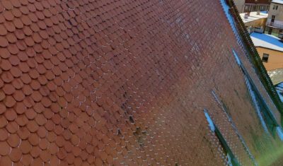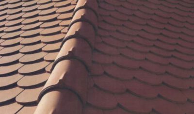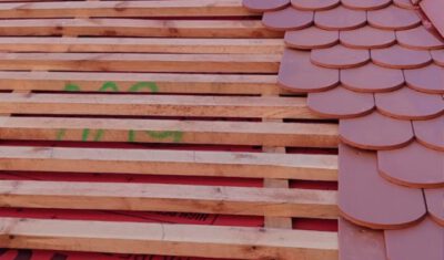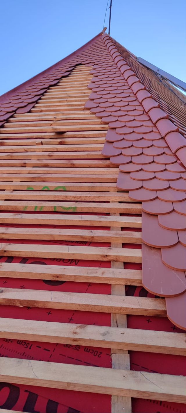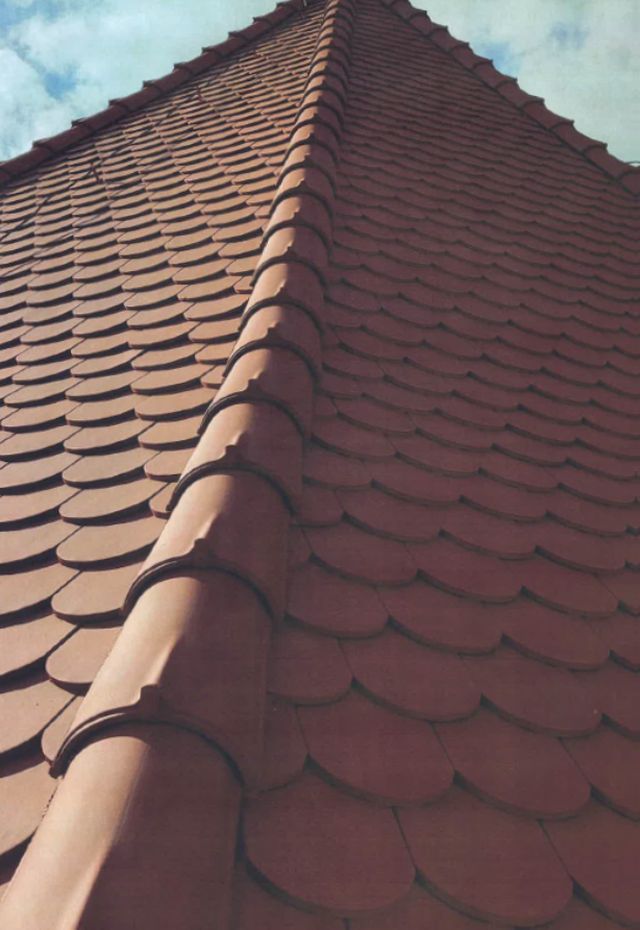 – Austausch der Dachziegel: rot gefärbte, matte Schuppenziegel,