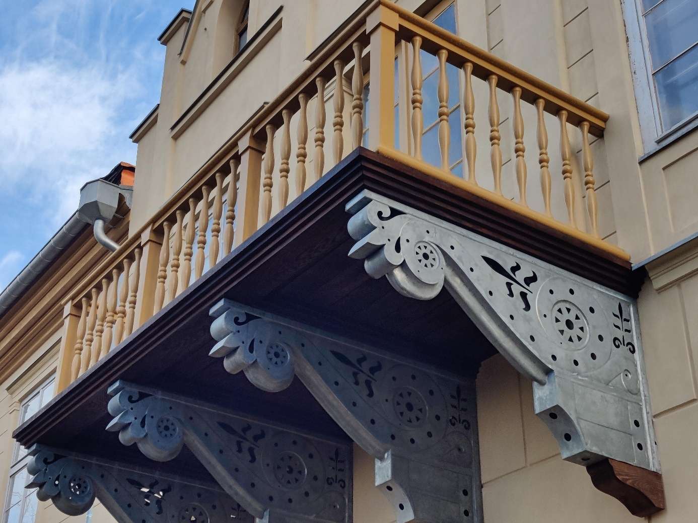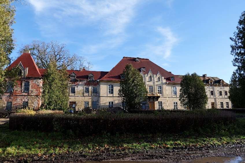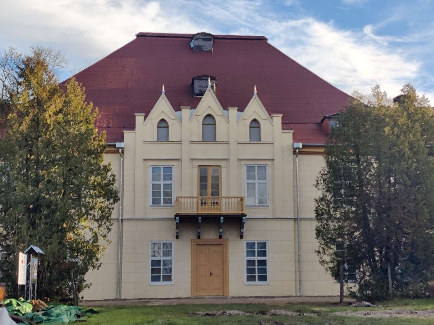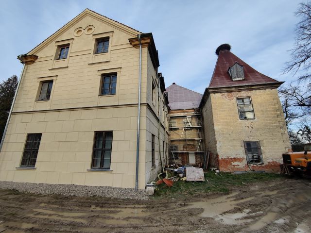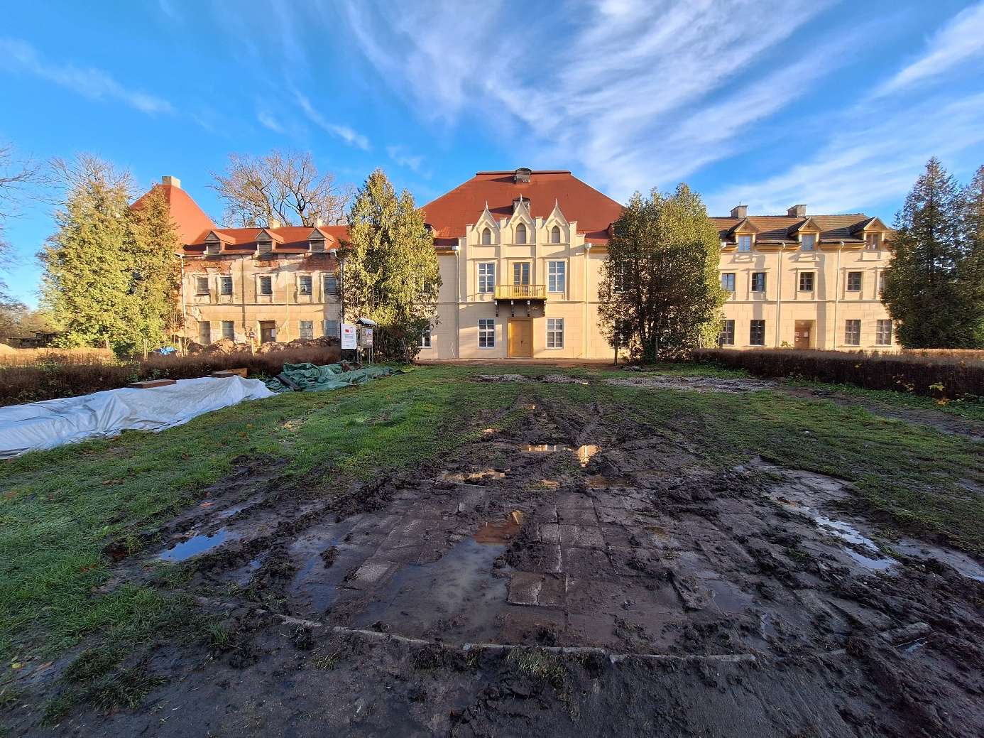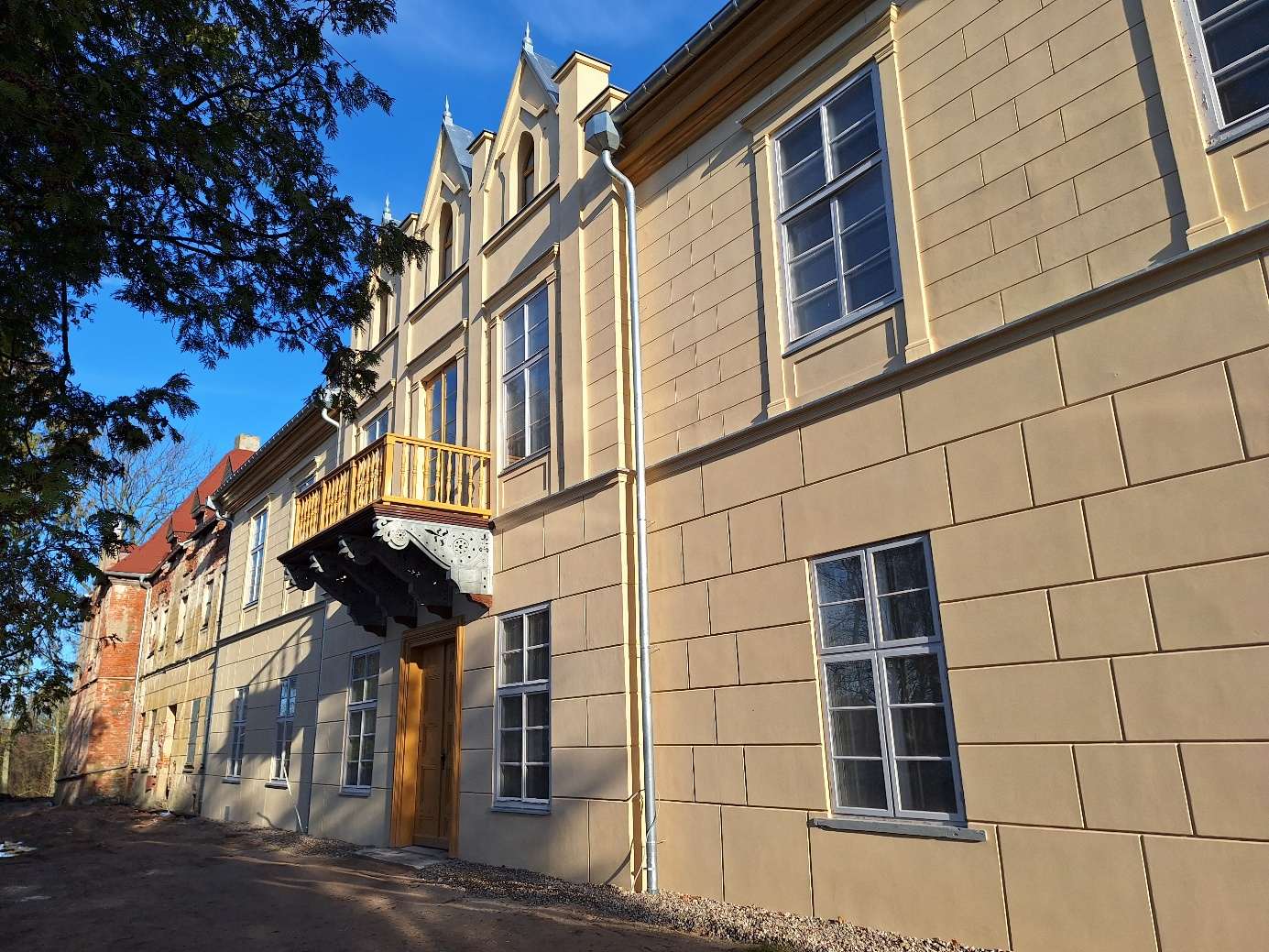 Die mit öffentlichen polnischen Mitteln geförderten Fassadenarbeiten wurden nach polenweiter öffentlicher Ausschreibung ausgeführt von der Olsztyner Restaurierungsfirma Transferart C. Grabowski. Der überkommene Putz war so schadhaft, dass er, mit Ausnahme weniger ausgewählter Stellen abgenommen und durch einen Kalkputz mit Trassanteil ersetzt worden ist. Nach der Farbbemusterung mit dem Denkmalamt wurde nach restauratorischem Voruntersuchungsergebnis ein neuer Silikatanstrich von der im Denkmalschutz allseits bewährten Firma Keim aufgebracht, ockerfarben, wie er im Barock auch im ehemaligen Ostpreußen üblich gewesen war. Die Regenfallrohre sind in Zinkblech erneuert. Dank einer weiteren Zuwendung des Woiwodschafts-Denkmalamts für 2025 an die PNF und statisch-konstruktiver Vorbereitung von innen (Außenwandbereich R 1.01) durch das Planungs- und Ingenieurbüro Prof. Wolfram Jäger, Radebeul in Zusammenarbeit mit der lokalen Baufirma Hohlbud, die u.a. die Arbeiten an Fundamenten, Drainage und Holzbalkendecken ausgeführt hat, war es außerdem möglich, den Balkon am Mittelrisalit des Kernbaues, der der Fassade einen starken Akzent verleiht, wiederherzustellen einschließlich der Rekonstruktion der markanten beiden Konsolen, auf denen der Austritt lagert.