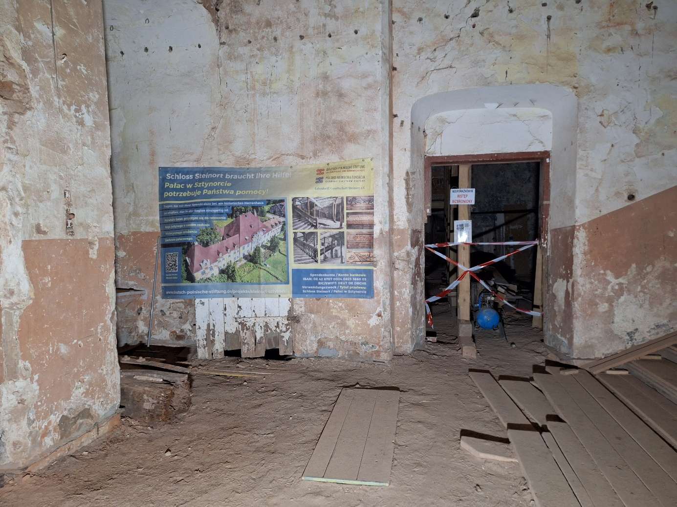 2024/25 konnten von der Deutsch-Polnischen Stiftung Kulturpflege und Denkmalschutz als Maßnahmenträger zu vom Deutschen Bundestag im Bundeshaushalt 2022 für die Fortführung der Notsicherung von Schloss Steinort in drei Tranchen etatisierten 600.000 EUR (2 x 150.000 EUR und 300.000 EUR), die der DPS in 2024 auf der Grundlage dreier Förderanträge von BKM bewilligt wurden, nacheinander die wertvollen historischen Holzbalkendecken von vier Kernbau-Innenräumen gesichert werden und darüber hinaus die restlichen Fundament- und Drainagearbeiten – sie betrafen den Westflügel – ausgeführt werden, wie ein kleinerer Teil der umfangreich notwendigen Horizontalabdichtungsarbeiten. Die Ausführung weiterer, noch im Maßnahmenpaket der dritten Fördertranche enthaltenen Sicherungsarbeiten, wurde nach 2026 verschoben.