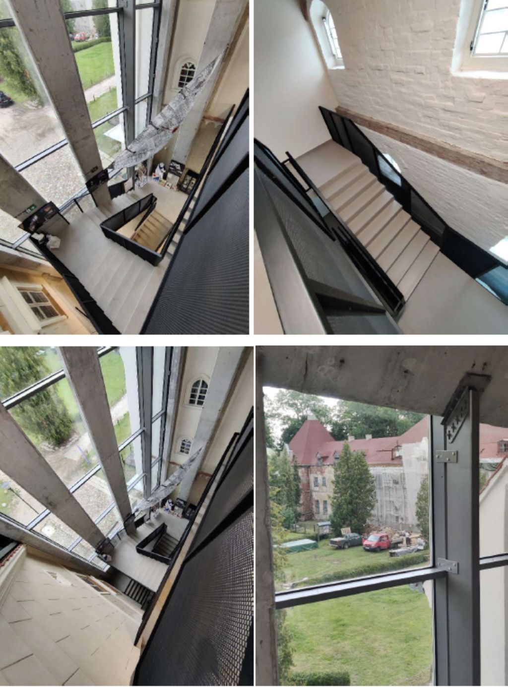 Zusätzliche Unterstützungen sind damit nicht mehr notwendig. Man kann dadurch die repräsentative Haupttreppe wieder ohne sich zu bücken vom EG in das Obergeschoss bzw. vom OG ins EG begehen. Sichtbar bleiben letztendlich nur die je 2 F 12 CFK-Rundstäbe in den Öffnungen, die man aber kaum wahrnimmt. Es handelt sich dabei um eine behutsame Hinzufügung, die das Gesamtbild nicht entstellt und als solche beim genauen Hinsehen erkennbar bleibt. Die Lösung ist damit mit der Charta von Venedig vereinbar. Die Stäbe wurden mit einem aufschäumenden Brandschutzanstrich versehen.