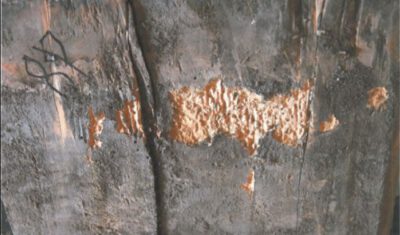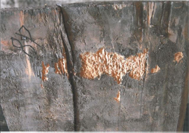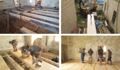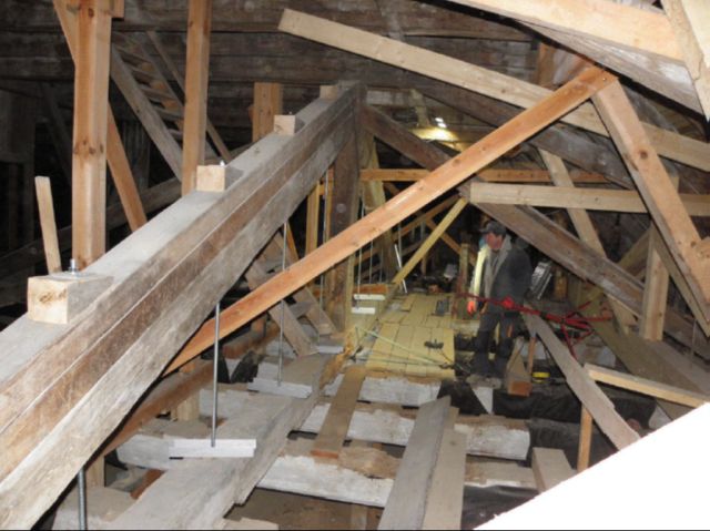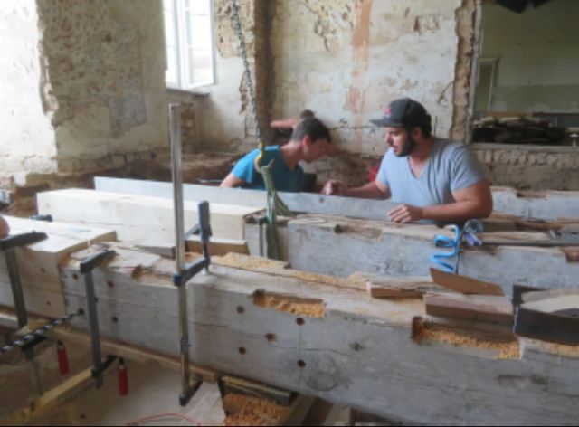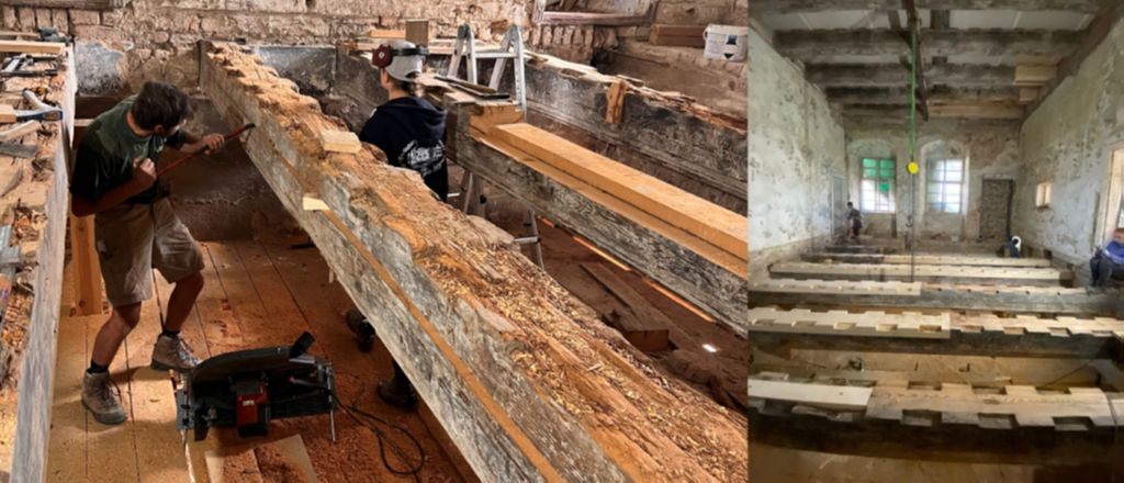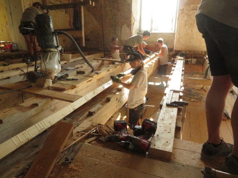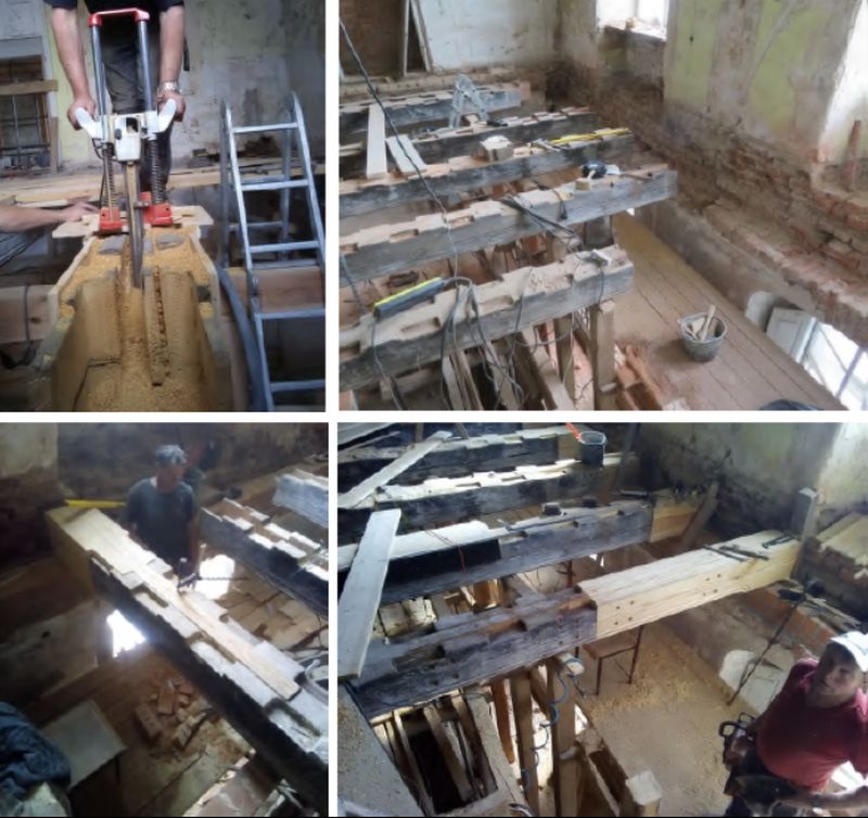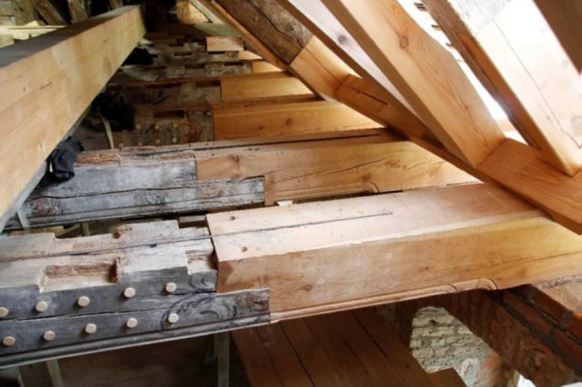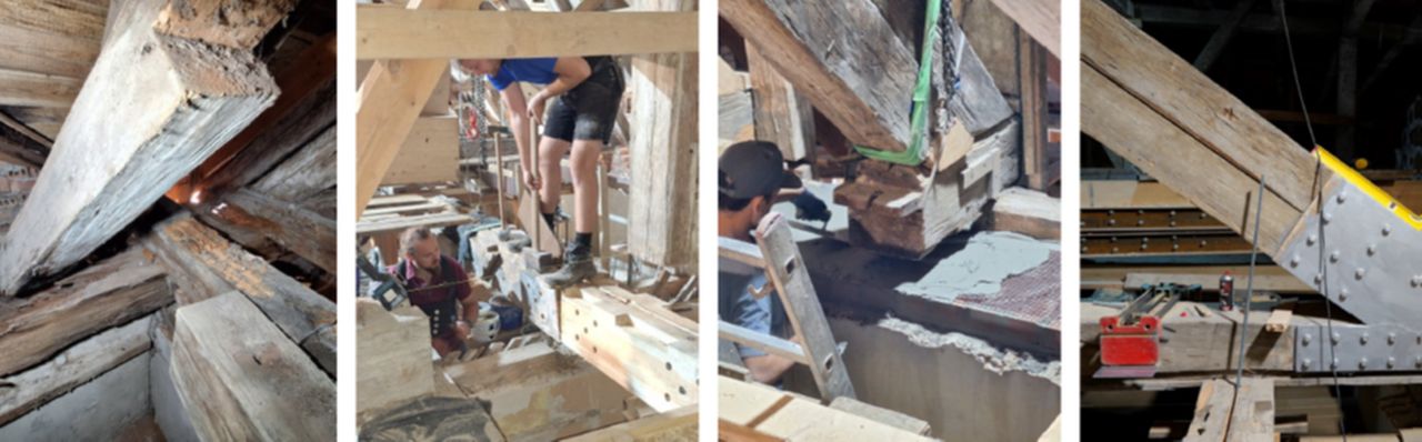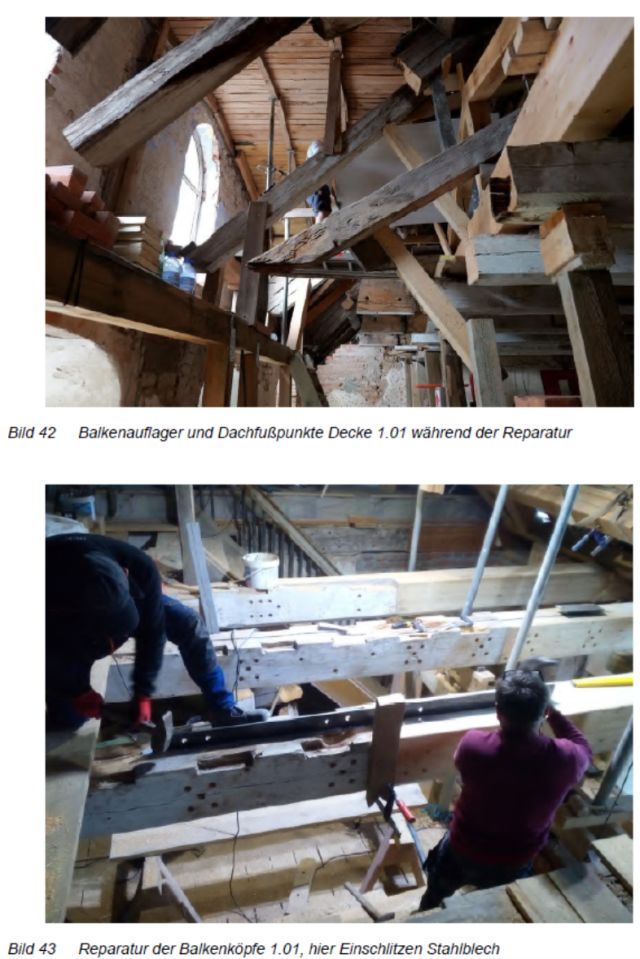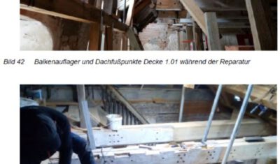 - Erneuerung der Balkenköpfe in traditioneller Form mit Stahlblechen bzw. Fingerzapfen – dabei sollte nur ein Minimum an Bestand verlorengehen: Verbindung der Bestandsbalken mit den anzusetzenden Balkenauflagern über Stahllaschen bzw. stehende Zapfen/Fingerzapfen. Dabei ist die Leimverbindung so herzustellen gewesen, dass sie voll tragfähig ist, um keinen Schlupf zuzulassen. Stabförmige Verbindungsmittel dienten dann nur zur Herstellung des Anpressdruckes.