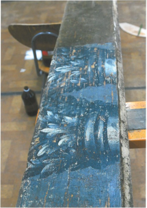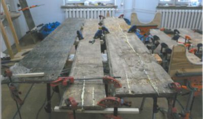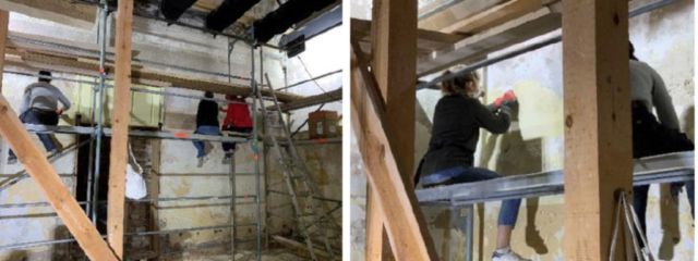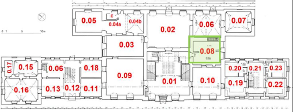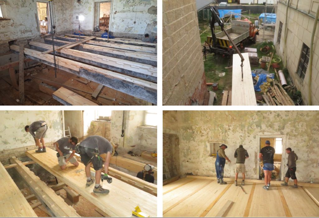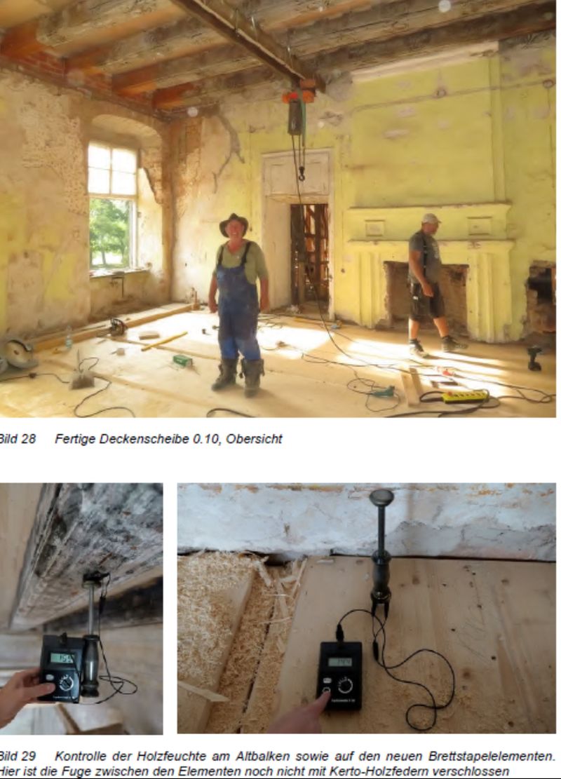 Für Decke Raum 0.08 ist die gleiche Technologie zum Einsatz gekommen, die bereits für die Räume 0.09 (im Werk) und 0.10 (in situ) verwendet wurde. Die Ertüchtigung der Decke 0.08 wird in situ durchgeführt unter Nutzung der Erfahrungen mit der Baustellenleimung der Decke 0.10 aus der vorherigen Förderperiode.