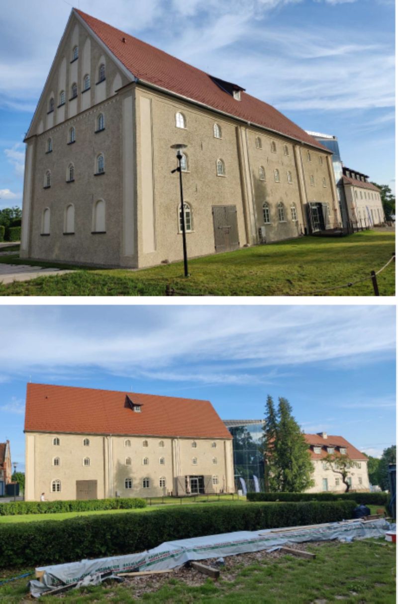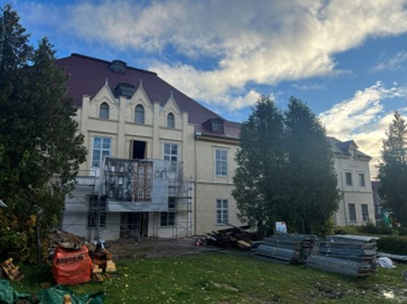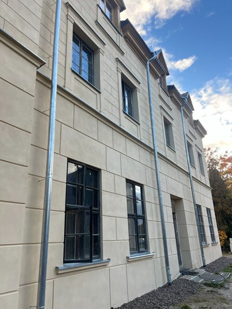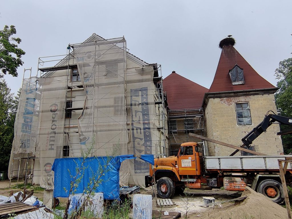 Die Fassadenarbeiten wurden nach polenweiter öffentlicher Ausschreibung ausgeführt von der Olsztyner Restaurierungsfirma Transferart C. Grabowski. Der überkommene Putz war so schadhaft, dass er, mit Ausnahme weniger ausgewählter Stellen abgenommen und durch einen Kalkputz mit Trassanteil ersetzt worden ist. Nach der Farbbemusterung mit dem Denkmalamt wurde nach restauratorischem Voruntersuchungsergebnis ein neuer Silikatanstrich von der im Denkmalschutz allseits bewährten Firma Keim aufgebracht, ockerfarben, wie er im Barock auch im ehemaligen Ostpreußen üblich gewesen war. Die Regenfallrohre sind in Zinkblech erneuert. Dank einer weiteren Zuwendung des Woiwodschafts-Denkmalamts für 2025 an die PNF und statisch-konstruktiver Vorbereitung von innen (Außenwandbereich R 1.01) durch das Planungs- und Ingenieurbüro Prof. Wolfram Jäger, Radebeul in Zusammenarbeit mit der lokalen Baufirma Hohlbud, die u.a. die Arbeiten an Fundamenten, Drainage und Holzbalkendecken ausgeführt hat, war es außerdem möglich, den Balkon am Mittelrisalit des Kernbaues, der der Fassade einen starken Akzent verleiht, wiederherzustellen einschließlich der Rekonstruktion der markanten beiden Konsolen, auf denen der Austritt lagert.