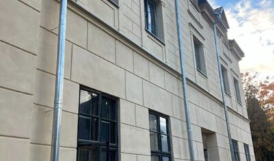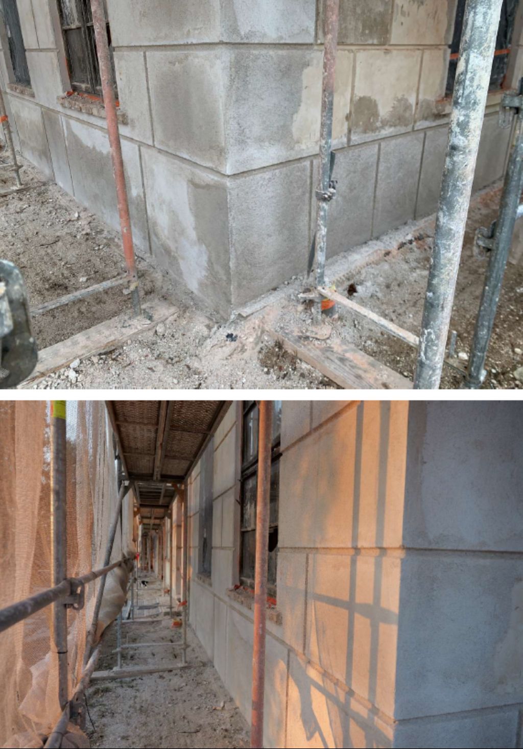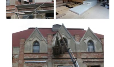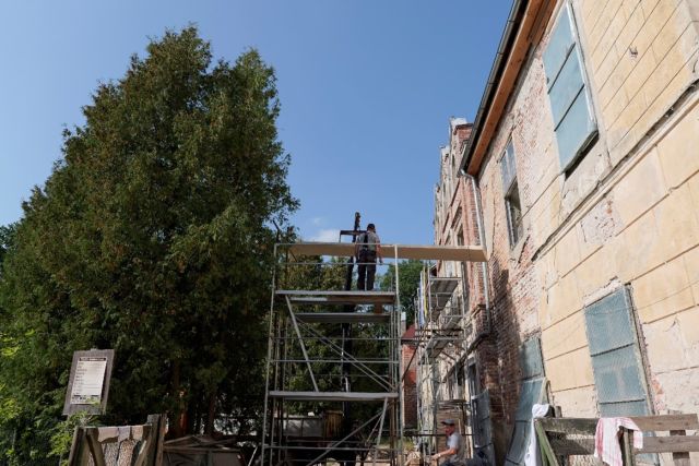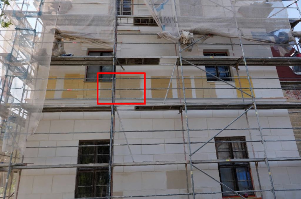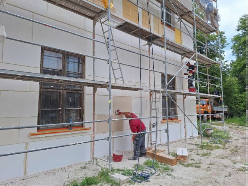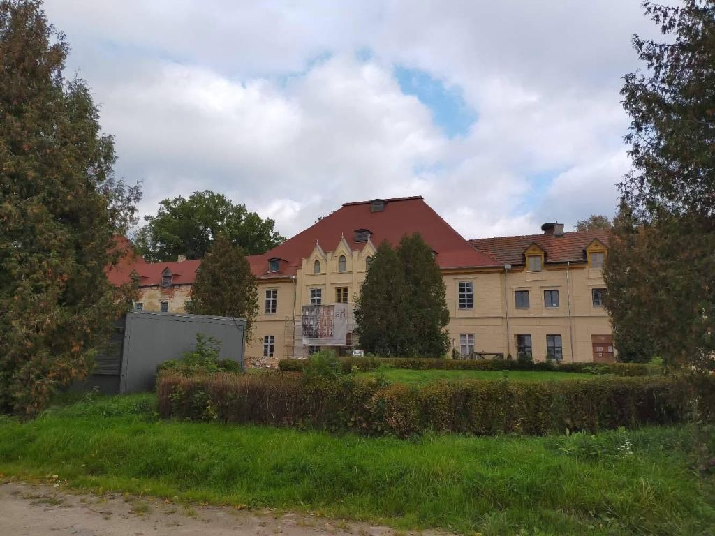 Die Fassadenarbeiten wurden nach polenweiter öffentlicher Ausschreibung ausgeführt von der Olsztyner Restaurierungsfirma Transferart C. Grabowski. Der überkommene Putz war so schadhaft, dass er, mit Ausnahme weniger ausgewählter Stellen abgenommen und durch einen Kalkputz mit Trassanteil ersetzt worden ist. Nach der Farbbemusterung mit dem Denkmalamt wurde nach restauratorischem Voruntersuchungsergebnis ein neuer Silikatanstrich von der im Denkmalschutz allseits bewährten Firma Keim aufgebracht, ockerfarben, wie er im Barock auch im ehemaligen Ostpreußen üblich gewesen war. Die Regenfallrohre sind in Zinkblech erneuert. Dank einer weiteren Zuwendung des Woiwodschafts-Denkmalamts für 2025 an die PNF und statisch-konstruktiver Vorbereitung von innen (Außenwandbereich R 1.01) durch das Planungs- und Ingenieurbüro Prof. Wolfram Jäger, Radebeul in Zusammenarbeit mit der lokalen Baufirma Hohlbud, die u.a. die Arbeiten an Fundamenten, Drainage und Holzbalkendecken ausgeführt hat, war es außerdem möglich, den Balkon am Mittelrisalit des Kernbaues, der der Fassade einen starken Akzent verleiht, wiederherzustellen einschließlich der Rekonstruktion der markanten beiden Konsolen, auf denen der Austritt lagert.