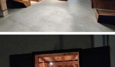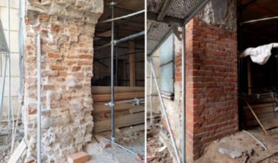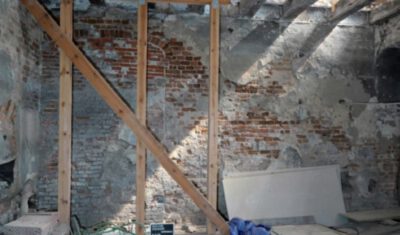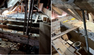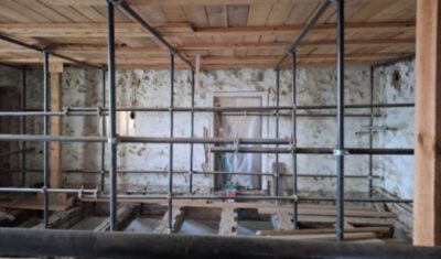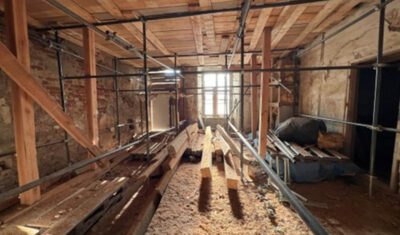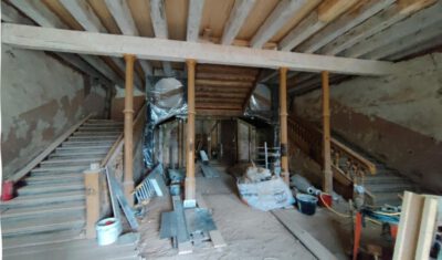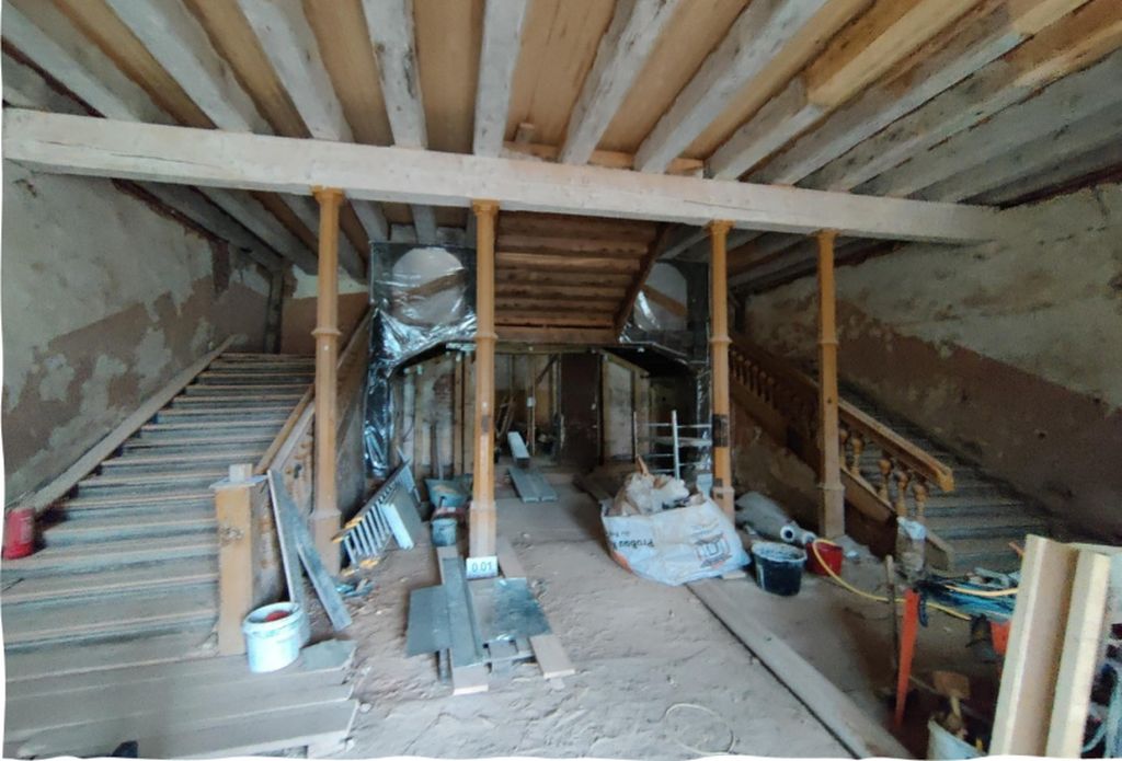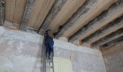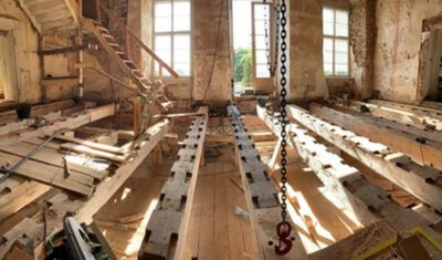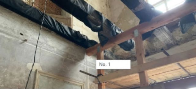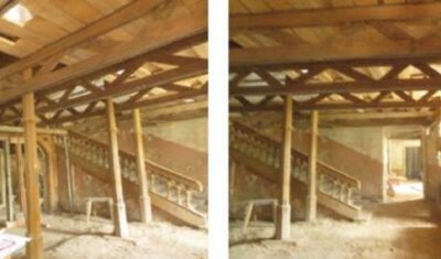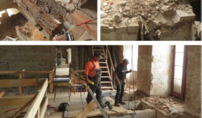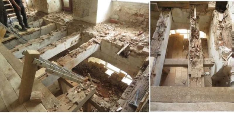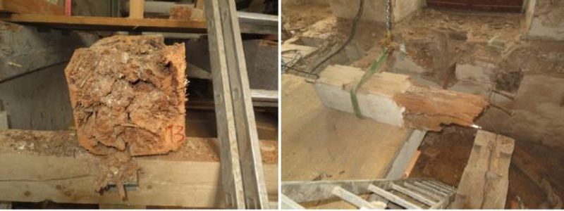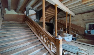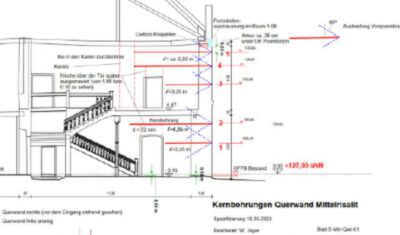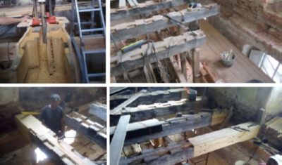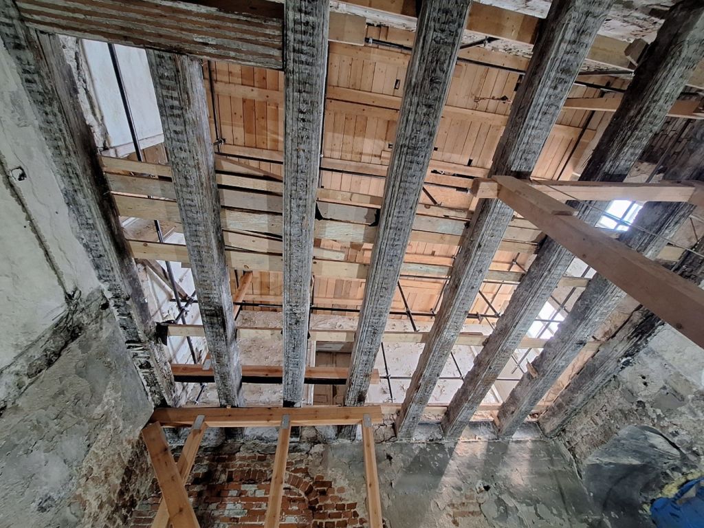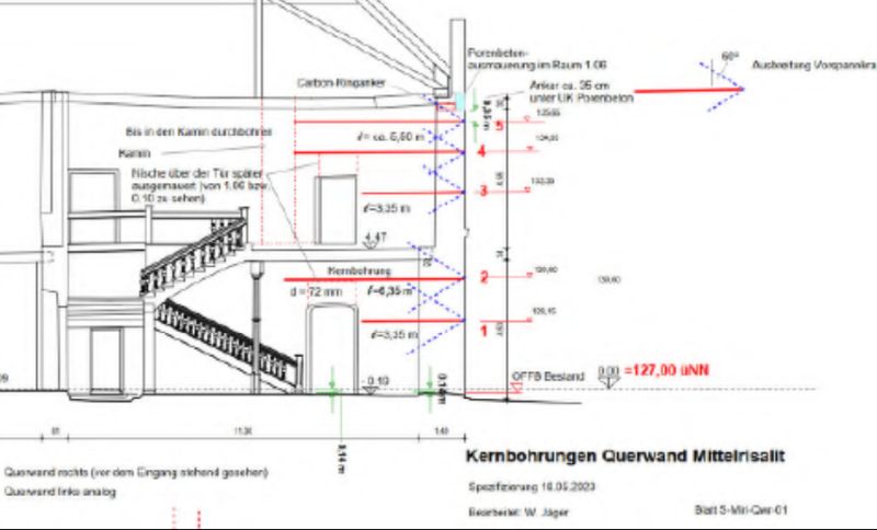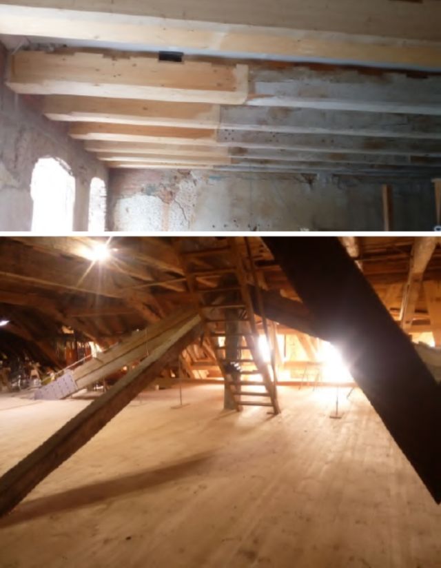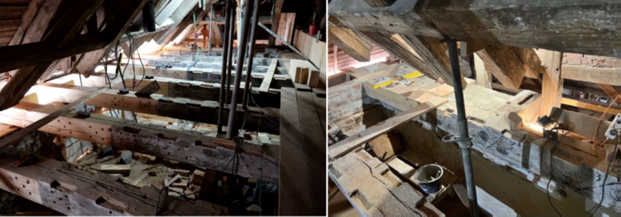 Das Podest auf halber Treppe war nicht ausreichend statisch abgefangen. Das hatte zu einer Durchbiegung des sichtbaren Biegebalkens geführt, der mit zwei Kantholzstützen und einem T-Rahmen provisorisch unterstützt gewesen ist. Das Ziel war, die historische Konstruktion weitgehendst zu belassen und keinen größeren Eingriff vorzunehmen. Dazu wurde der Biegebalken durch zwei eingeschlitzte CFK-Lamellen ertüchtigt, wodurch die Biegetragfähigkeit wesentlich erhöht wird. In die Öffnungen rechts und links werden zwei CFK-Rundstäbe ca. 12 mm diagonal eingebaut. Die in diesen entstehenden Zugkräfte werden nach oben in die Deckenscheibe eingeleitet, durch die sie wegen der Scheibenwirkung der neuen Brettschichtholzplatten gut aufgenommen werden können.