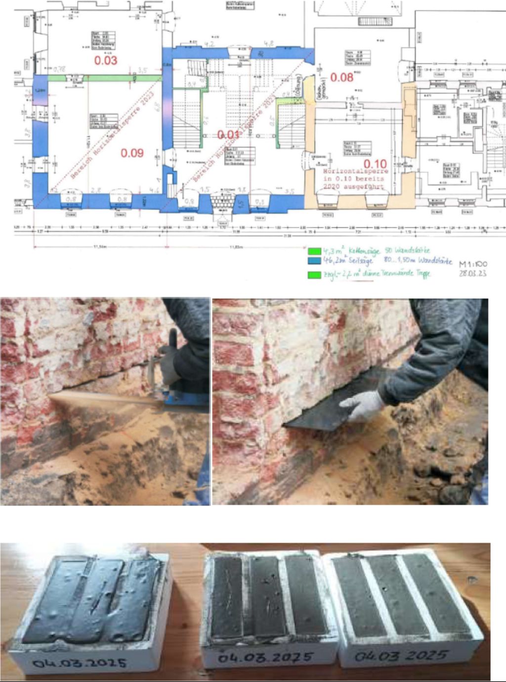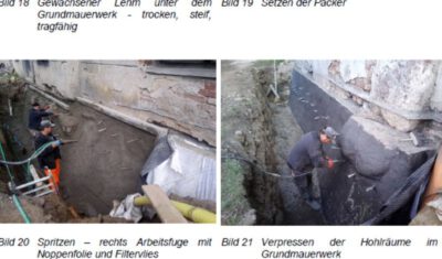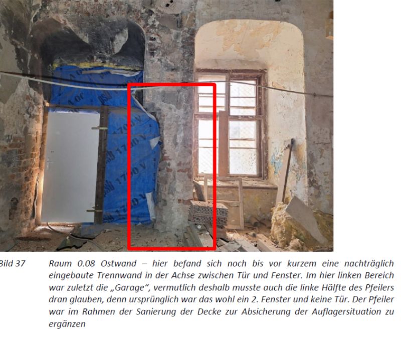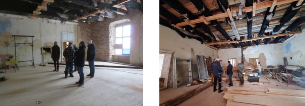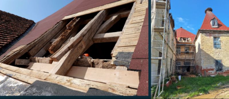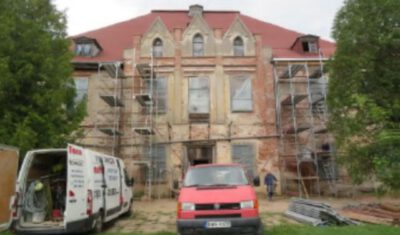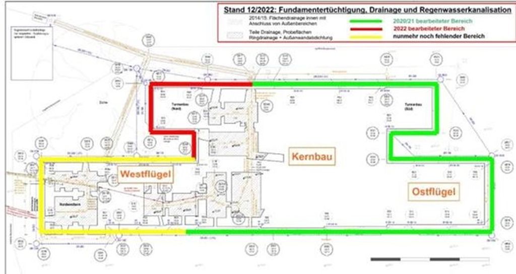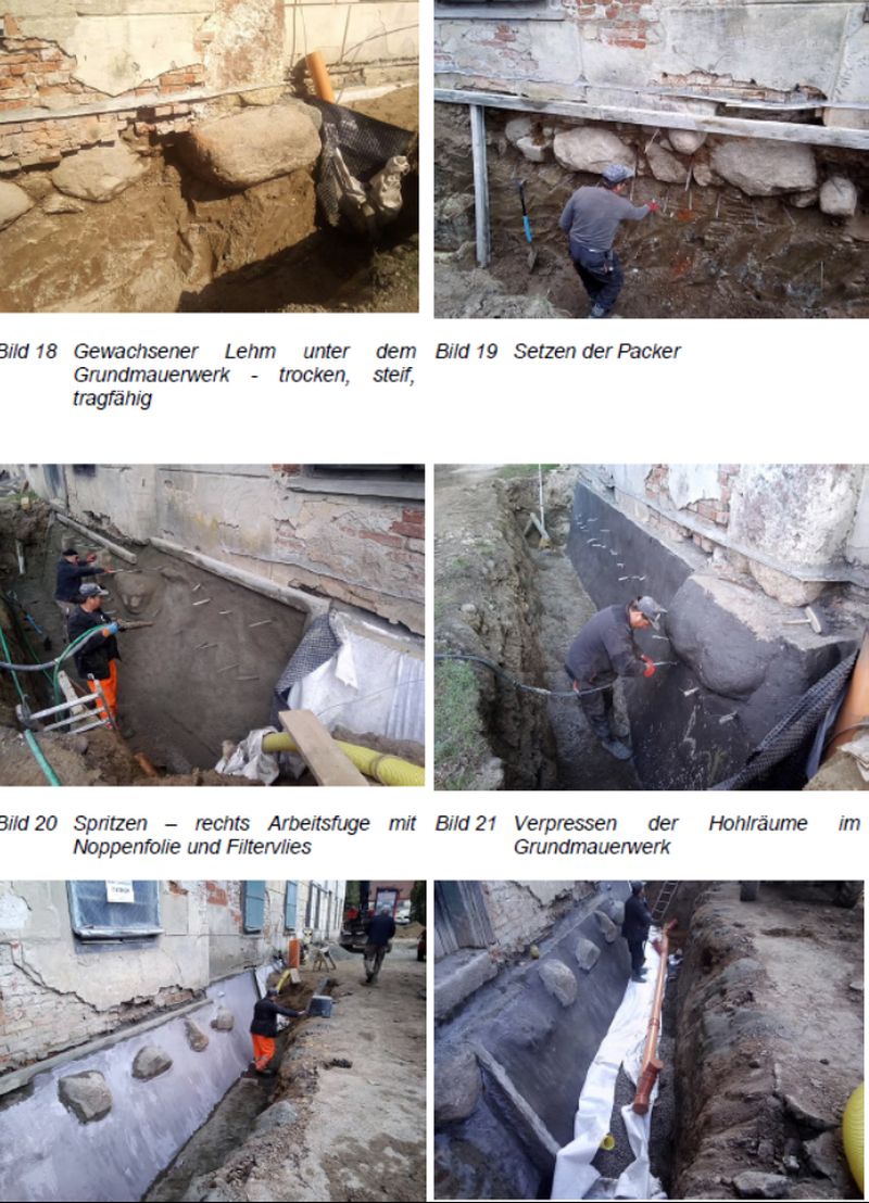 - Ausführender Baubetrieb 6. Sicherungsmaßnahme (2014 – Tiefbauarbeiten), 7. Sicherungsmaßnahme (2015 – Tiefbauarbeiten) ), 8. Sicherungsmaßnahmen 2019/20, 9. Sicherungsmaßnahmen 2020/21 (Gerüstbau, Winterfestmachung, Fundamente, Drainage, Horizontalsperre, Abbruch- und Sicherungsarbeiten u.a.), 10. Sicherungsmaßnahmen 2022/23 (u.a. restliche Drainage- und Abdichtungsarbeiten, Einbringung bearbeitete Deckenbalken Raäume EG 0.09 und OG 1.06): u.a. Fa. Budowlana „Hohlbud“, 11-610 Pozezdre