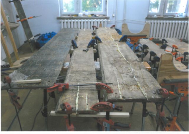 - Aufleimen einer rechteckförmige Distanzbohle, die über die Länge gleichbleibenden Querschnitt hat; Anpressdruck über Schraubleimung. Dazu wurde eine Schablone eingesetzt, die ein Versetzen der Verschraubung von Distanzbohle und Leimholzplatte sicherstellt, um Kollisionen der Verbindungsmittel auszuschließen