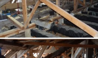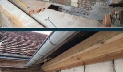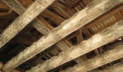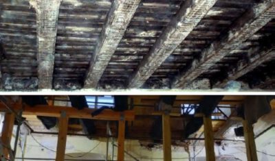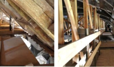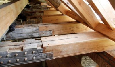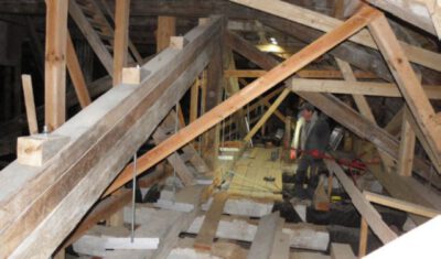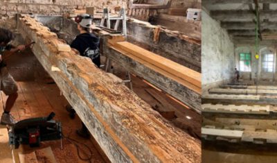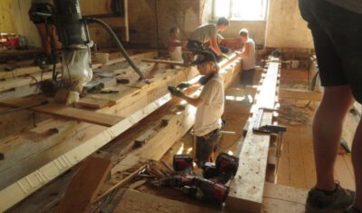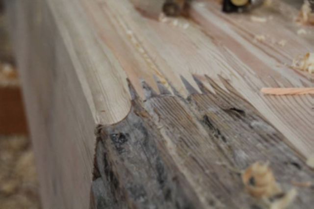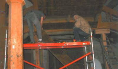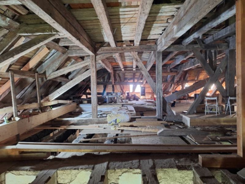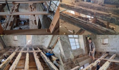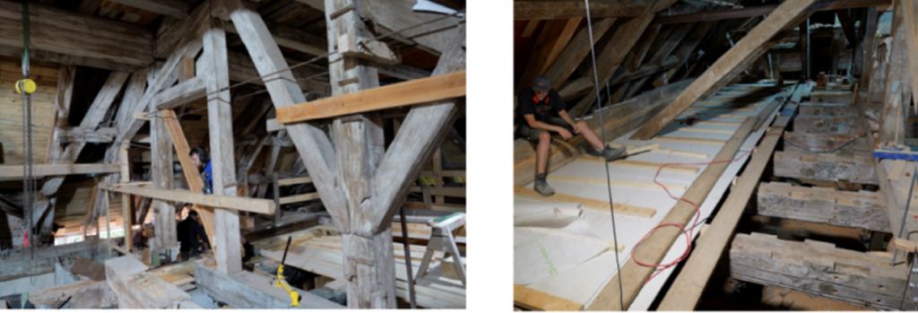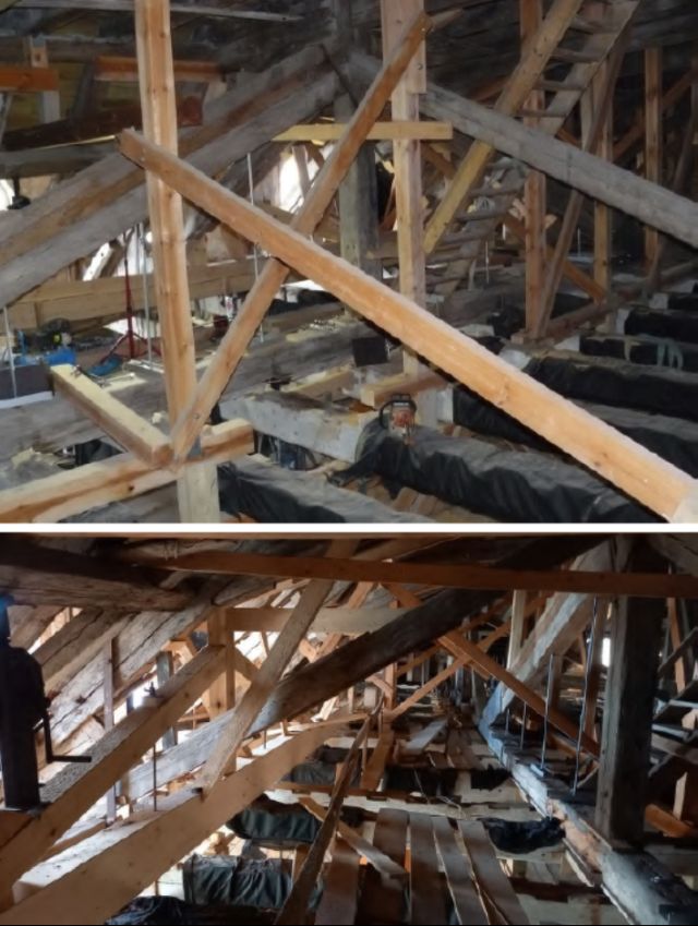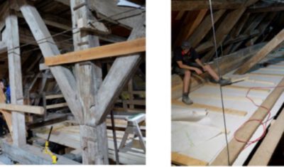 - Erneuerung der Balkenköpfe in traditioneller Form mit Stahlblechen bzw. Fingerzapfen – dabei sollte nur ein Minimum an Bestand verlorengehen: Verbindung der Bestandsbalken mit den anzusetzenden Balkenauflagern über Stahllaschen bzw. stehende Zapfen/Fingerzapfen. Dabei wurde die Leimverbindung so hergestellt, dass sie voll tragfähig ist, um keinen Schlupf zuzulassen. Stabförmige Verbindungsmittel dienten dann nur zur Herstellung des Anpressdruckes.