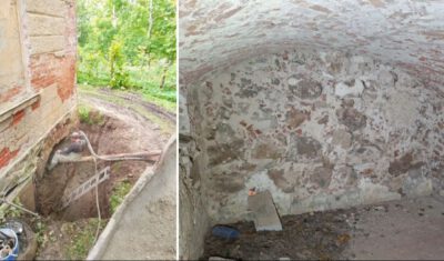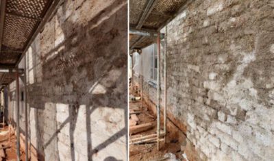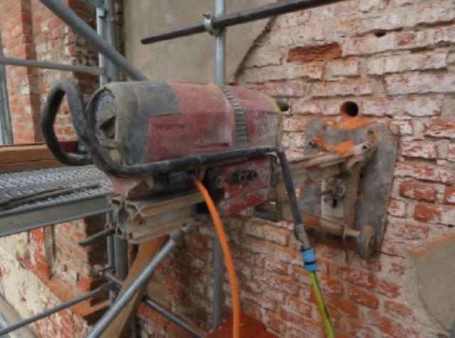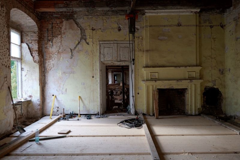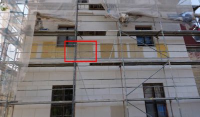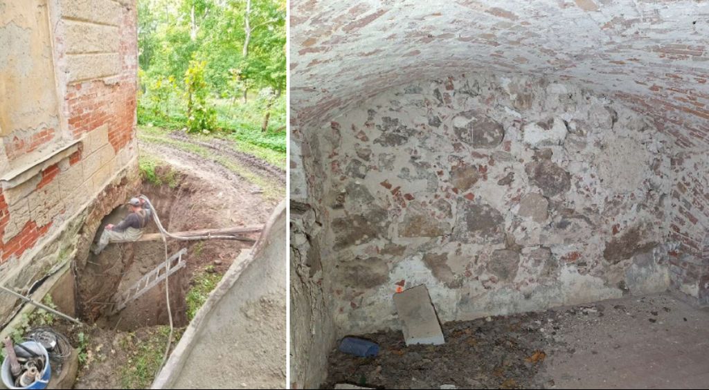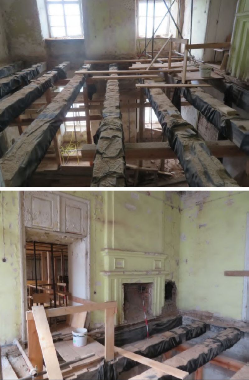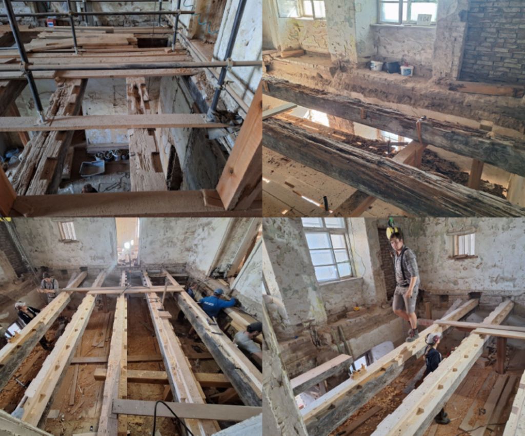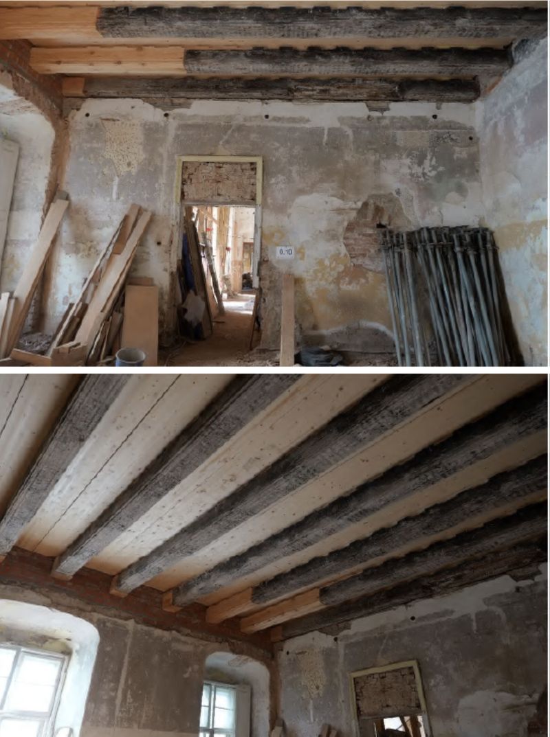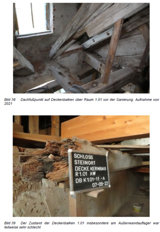Der polnischen Schwesterstiftung Polsko-Niemiecka Fundacha Ochrony Zabytków Kultury (PNF) der Deutsch-Polnischen Stiftung Kulturpflege und Denkmalschutz (DPS) ist es 2024 erstmals gelungen, vom Polnischen Ministerium für das Nationalerbe (Kulturministerium) mit 1,4 Mio PLN (rund 323.000 EUR) einen größeren staatlichen Förderbetrag zur Erhaltung von Schloss Steinort zu erhalten. Die Zuwendung lieg über die Stadt Węgorzewo (Angerburg), zu der Steinort als Ortsteil gehört. Der Förderantrag der PNF wurde in Abstimmung mit dem Denkmalamt der Woiwodschaft Ermland-Masuren in Olsztyn (Allenstein) für eine Teilinstandsetzung der Hauptfassade (Seeseite) von Schloss Steinort gestellt und in Warschau bewilligt. Nachdem die deutschen Bundesmittel all´ die Jahre ausschließlich für Notsicherungsmaßnahmen zu verwenden waren, so vor allem für statisch-konstruktive Arbeiten, wie Fundament-, Deckenbalken- und Dachstuhl- und Dachhautsicherung, alles Arbeiten, mit denen die schon vorhanden gewesene Teileinsturzgefahr abgewendet werden konnte, die jedoch für vorbeigehende Besucher zur Kategorie „nicht sichtbar“ gehören, war es der PNF ein großes Anliegen, mit dem Projekt der Teilfassadeninstandsetzung endlich ein nach außen wirksames Zeichen zu setzen. Üblicherweise fängt man bei der Sanierung maroder Baudenkmäler ja mit dem Dach an und arbeitet sich dann bis zur Außenfassade weiter. Im Fall Steinort, alles eine Frage der Finanzmittel. Die 1,4 Mio PLN-Zuwendung hätte in keinster Weise für das Dach des Kernbaues gereicht und wegen des umfangreichen Schadensbilds auch kaum für eine Dachinstandsetzung des Westflügels. Wenn diese auch geboten war, so wäre eine solche Teilmaßnahme zudem nicht anschaulich genug gewesen. Bevor des mit den Fassadenarbeiten losgehen konnte, war es einerseits erforderlich, den Traufbereich im Abschnitt Kernbau zu sanieren. Holzkonstruktionselemente wie Mauerlatte, Deckenbalkenenden und Sparrenfußpunkte waren völlig verfault und mussten erneuert werden (Bereich R 1.07/R 1.08). Und andererseits war bei den Außenwänden von R 0.09 und 0.01 erst noch die Horizontalsperre einzubauen.