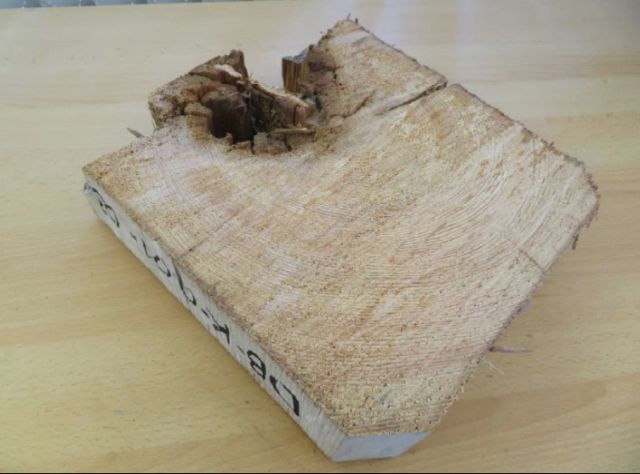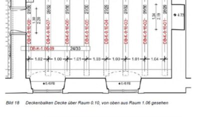 - Die Leimholzplatte erhielt vorher oberseitig auf beiden Seiten eine Nut, die nach dem Verlegen eine Kerto-Feder über jeweils 2 benachbarte Leimholzplatten aufnimmt und über diese verschraubt worden ist. Mit diesen Maßnahmen wurde die Scheibenwirkung der Decke (wieder) hergestellt.