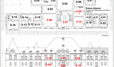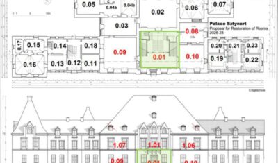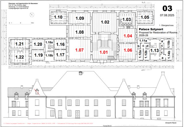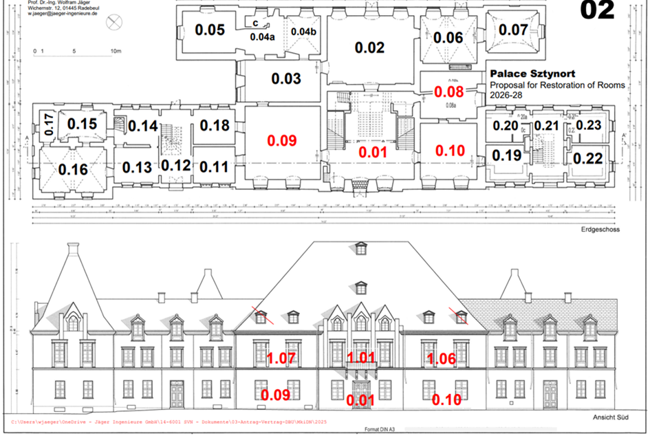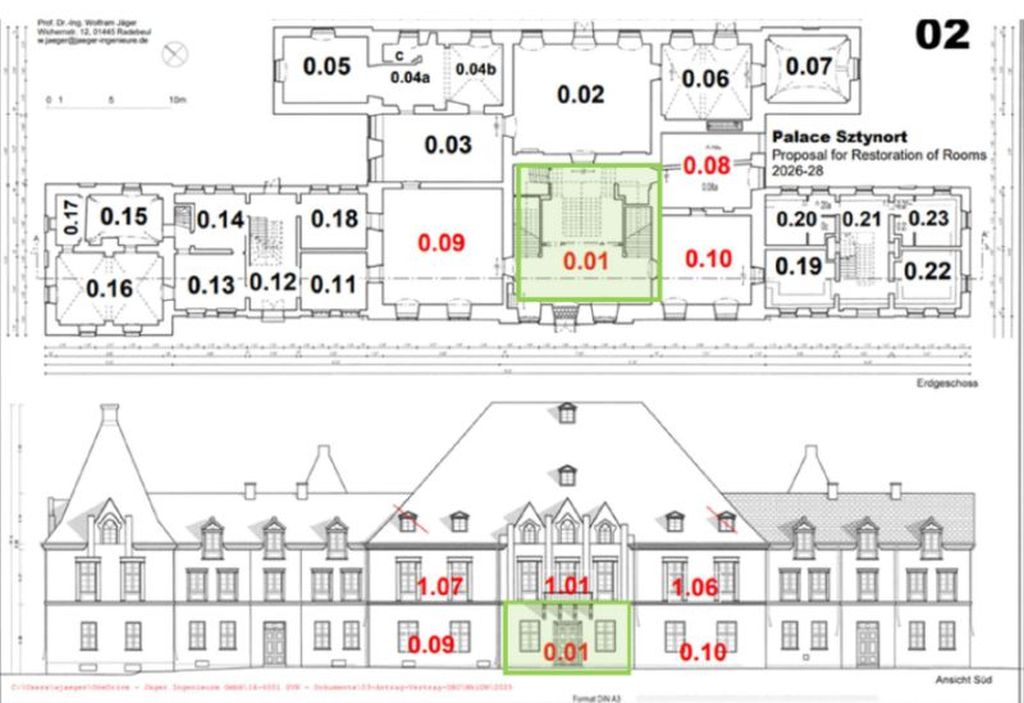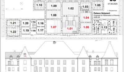 Ein PNF-Förderantrag beim Polnischen Kulturministerium auf Fortführungsförderung 2026 aus dem nationalen Denkmalschutzprogramm hat die Konservierung und Restaurierung der Raumfassung der Räume 0.09 und 0.10 zum Inhalt. Die Maßnahme beinhaltet die konservatorisch-restauratorische Untersuchung der seit vielen Jahren eingelagerten polychromen historischen Deckenbretter und, soweit sie die Räume 0.09 und 0.10 betreffen, deren Wiedereinbau in situ. Die beiden Räume sollen ja demnächst auch einen Unterboden und eine Temperierung bekommen. Ziel der Maßnahme ist es, die beiden besagten Räume restauratorisch so weit herzurichten , dass sie BesucherInnen als Attraktion präsentiert werden können und ihnen eine Vorstellung geben, wie Schloss Steinort in größerem Umfang innen aussehen wird, wenn seine Instandsetzung und Restaurierung einmal abgeschlossen ist. Indes laufen Anstrengungen, auch an der deutschen Politik dranzubleiben, um den bisher bei der Erhaltung von Schloss Steinort erzielten Teilerfolg weiterauszubauen. Denn nur mit ihrer und polnischer staatlicher weiterer Unterstützung wird es gelingen, Schloss Steinort als europäisches Kulturerbe mit seiner jahrhundertealten ostpreußischen und polnischen Geschichte dauerhaft zu bewahren.
