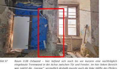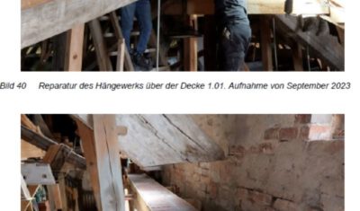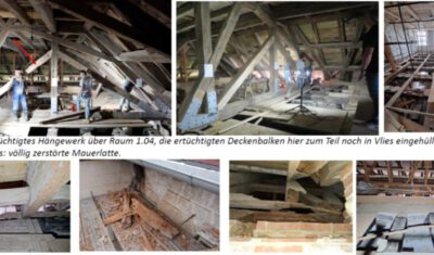 Und als begleitende Maßnahmen: Schließen der Türen zu den Räumen, in denen die Decken gesichert worden sind, die Dämmung der Heizleitungen, die Weiterführung der Elt-Einspeisung durch den Raum 0.10, laufende Instandhaltungen der bisherig realisierten Arbeiten.