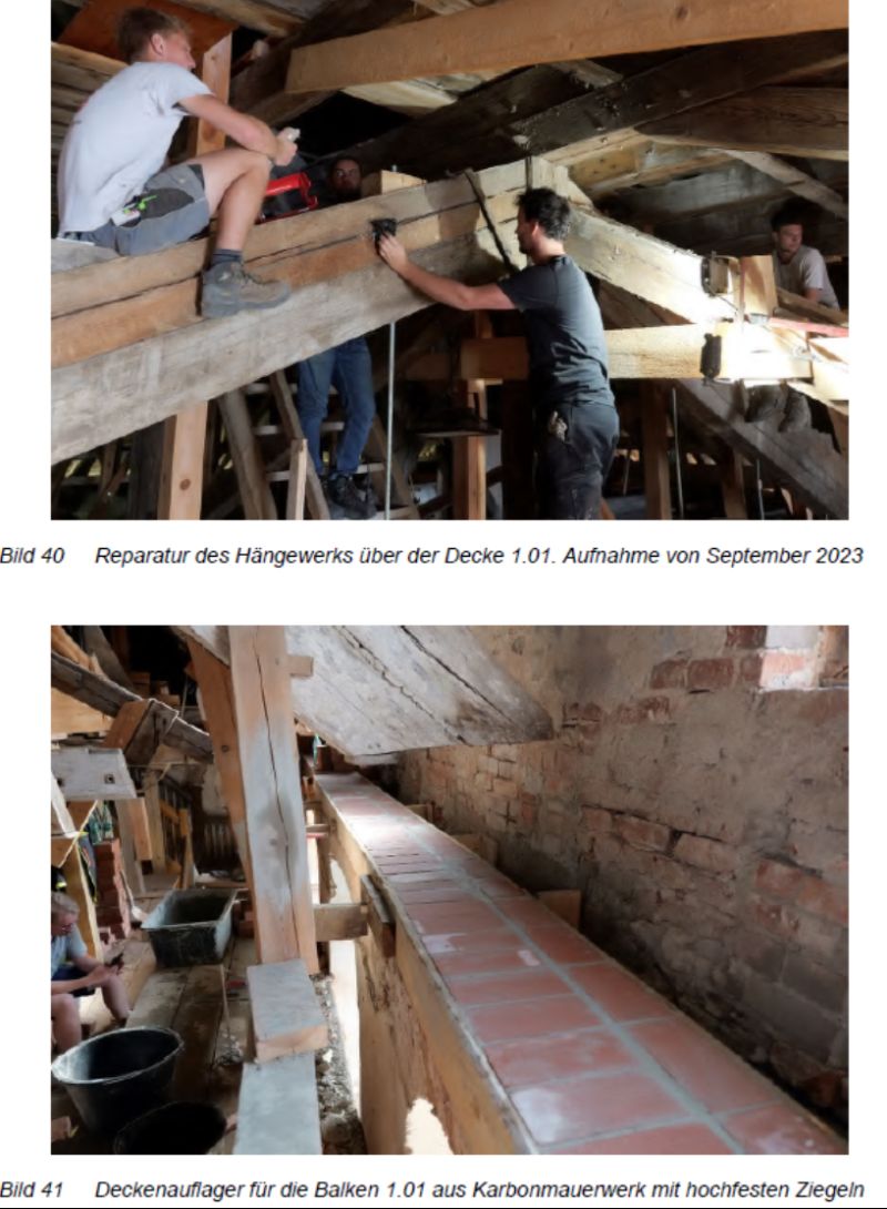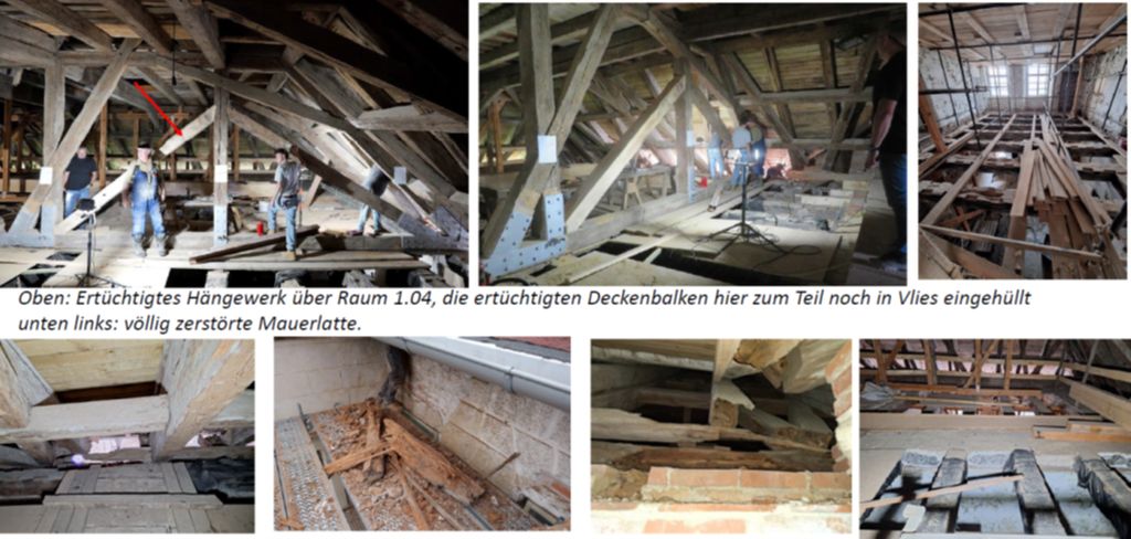 Nachdem wesentliche Notsicherungsmaßnahmen dank der Bereitstellung von finanziellen Mitteln ausgeführt werden konnten und noch können, bedarf diese Phase der Rettung eines Abschlusses. Dazu zählen die endgültige Fertigstellung der Drainage (Westflügel), der weitere Einbau von Deckenscheiben zur Gebäudestabilisierung, die Herstellung angemessener Raumluftverhältnisse zur Bewahrung der polychromen Bemalungen an Deckenbalken und Wänden, erforderliche brandschutztechnische Maßnahmen, Einbau von Fußböden, Ertüchtigung von Treppen, Wänden/Pfeilern und nicht zuletzt der Dachkonstruktion/Dachdeckung.