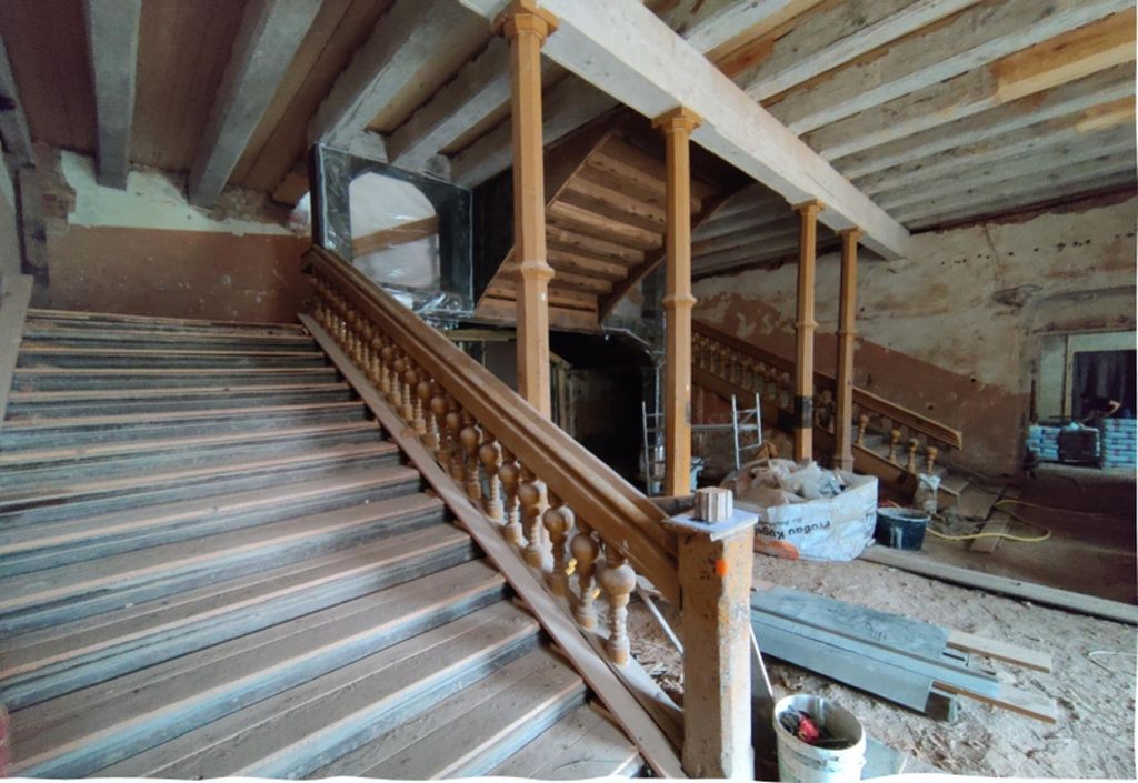 Mit den vom Bundesverwaltungsamt 2024 bewilligten ersten 150.000 EUR, etatisiert im Bundeshaushalt 2022, wurde bis Ende Juli 2025 an Maßnahmen ausgeführt: Sicherung der Bausubstanz von Schloss Steinort/Sztynort, Polen; Decke über Raum 0.01 im EG (Foyer Haupttreppenhaus) und Decke über Raum 1.04 im OG.