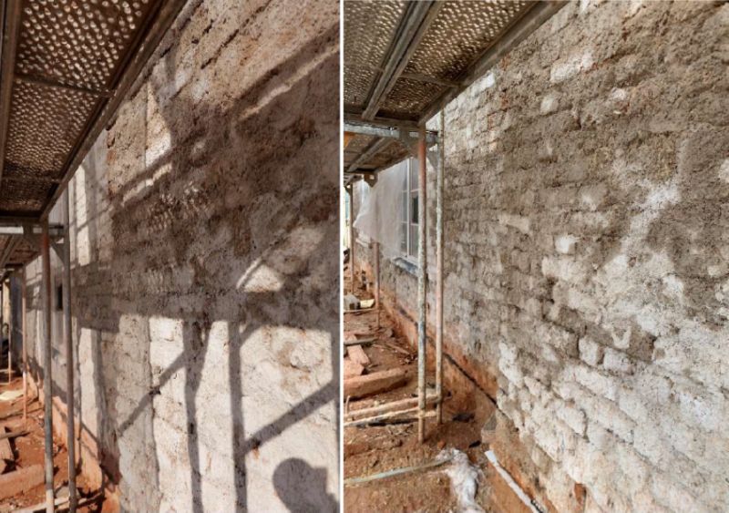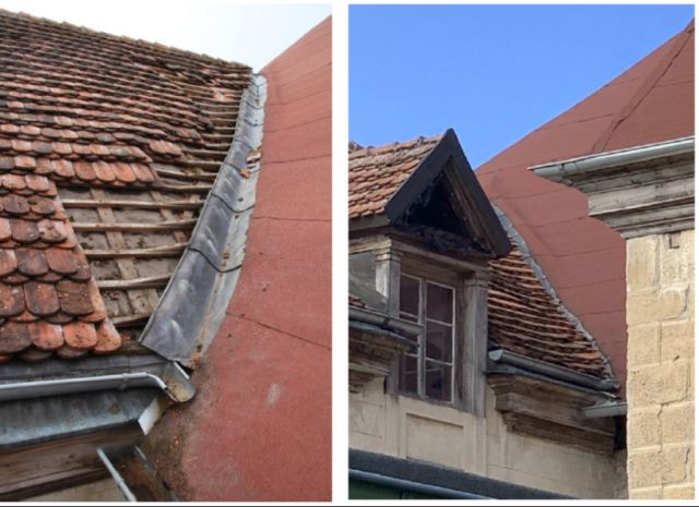 Im Kernbau herrscht Außenklima mit Verzögerung. In der Übergangszeit im Frühjahr kommt es in einer gewissen Zeitspanne zu Kondenswasserbildung aufgrund der warmen Luft und der kühlen Wände. Die Luftfeuchtigkeit (und damit auch die Ausgleichsfeuchte des Materials) ist bei Niederschlagswetter sehr hoch. Das führt dazu, dass die polychrome Deckenbalken- und Wandfriesbemalung im Laufe der Zeit angegriffen wird und immer mehr nachlässt. Dieser Prozess kann erst gestoppt werden, wenn ein vernünftiges Raumklima garantiert werden kann. Die Wetterfestigkeit kann somit erst nach Abschluss der Räume, nach Unterbindung von Feuchtenachschub, nach dem Aufbringen von mindestens einer Lage Außenputz und nach Schließen der Fenster garantiert werden. Die drei Gebäudeteile sind stark vom Hausschwamm befallen, besonders der historische Kernbau (2021/22 nicht aktiv). Der Hausschwamm befindet sich im Holz und im Mauerwerk. Sichtbare Wachstumserscheinungen sind zu entfernen und befallenes Material auszubauen.