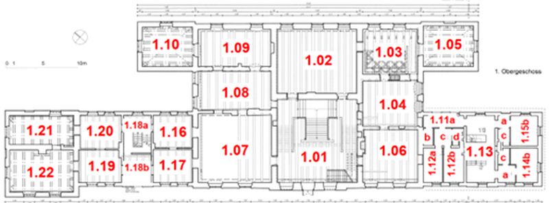 Für Decke Raum 0.01 ist die gleiche Technologie zum Einsatz gekommen, die bereits für die Räume 0.09 (im Werk) und 0.10 (in situ) verwendet wurde. Die Ertüchtigung der Decke 0.01 ist in situ durchgeführt worden unter Nutzung der Erfahrungen mit der Baustellenleimung der Decke 0.10 aus der vorherigen Förderperiode.