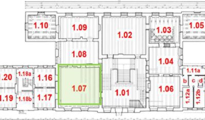Für Decke Raum 1.07 kam die gleiche Technologie zum Einsatz, die bereits für den Raum 1.06 verwendet wurde. Die Ertüchtigung der Decke 1.07 wurde in situ durchgeführt unter Nutzung der Erfahrungen mit den Decken 1.01 und 1.06 aus vergangenen Förderperioden. Optimierungen, die daraus resultieren, sind eingearbeitet, vor allem was das verwendete Material betrifft.