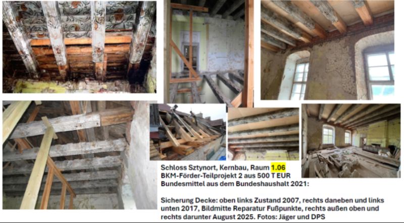Mit den 2024 bewilligten zweiten 150.000 EUR Bundesmittel, etatisiert im Bundeshaushalt 2022, übertragen, wurde bis Ende Oktober 2025 an Maßnahmen ausgeführt: Sicherung der Bausubstanz von Schloss Steinort/Sztynort, Polen; Decke über Raum 0.08 im EG und Decke über Raum 1.07 im OG.