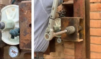 - Ausfräsen der Bestandsbalken oberseitig rechteckförmige Nut mittels Oberfräse. Die Oberfräse wurde auf einem Schlitten installiert, der über zwei eingemessene Führungsbalken über die gesamte Länge des Bestandsbalkens läuft